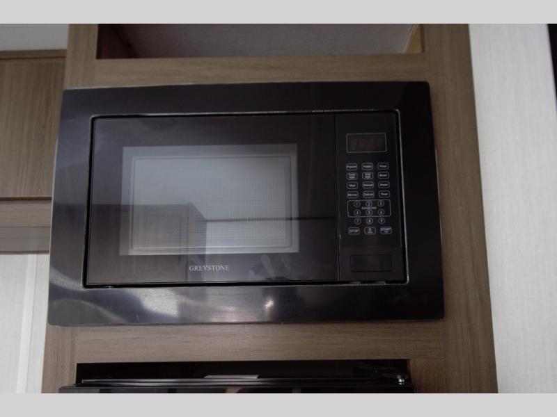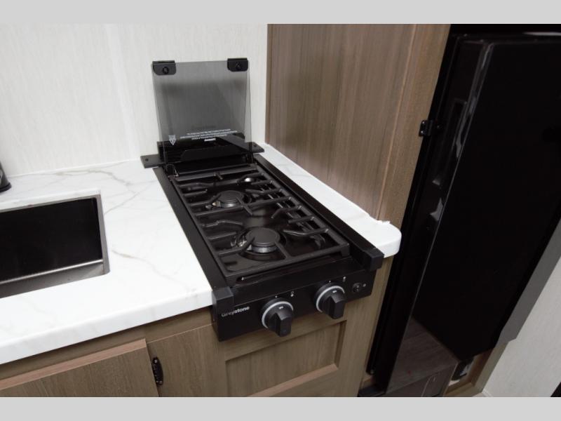 • Kitchen Essentials – Two-burner range, 12V refrigerator, microwave, and seamless faux marble countertops