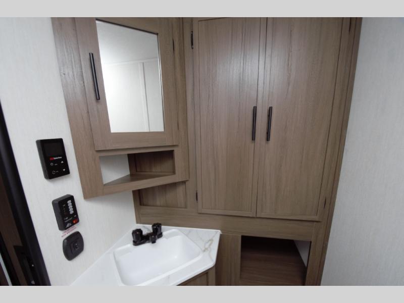 Featuring a flush-mount stainless steel sink, large pantry, 12V refrigerator, and sleek LED lighting. -