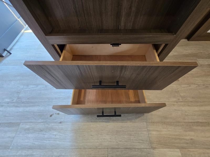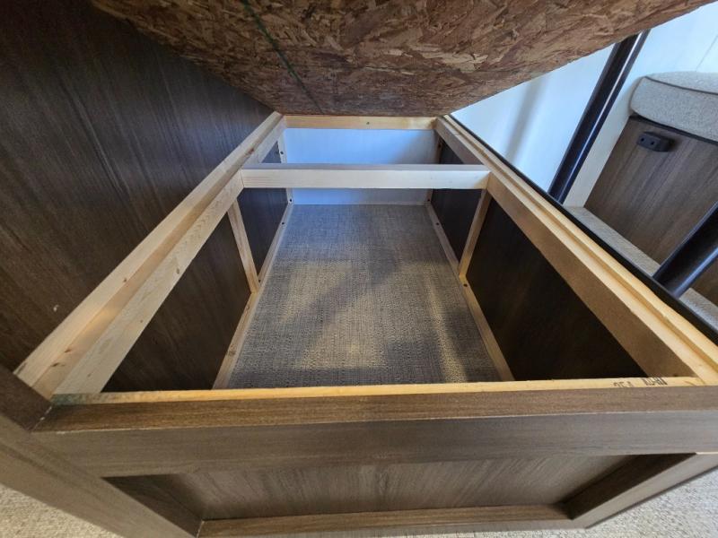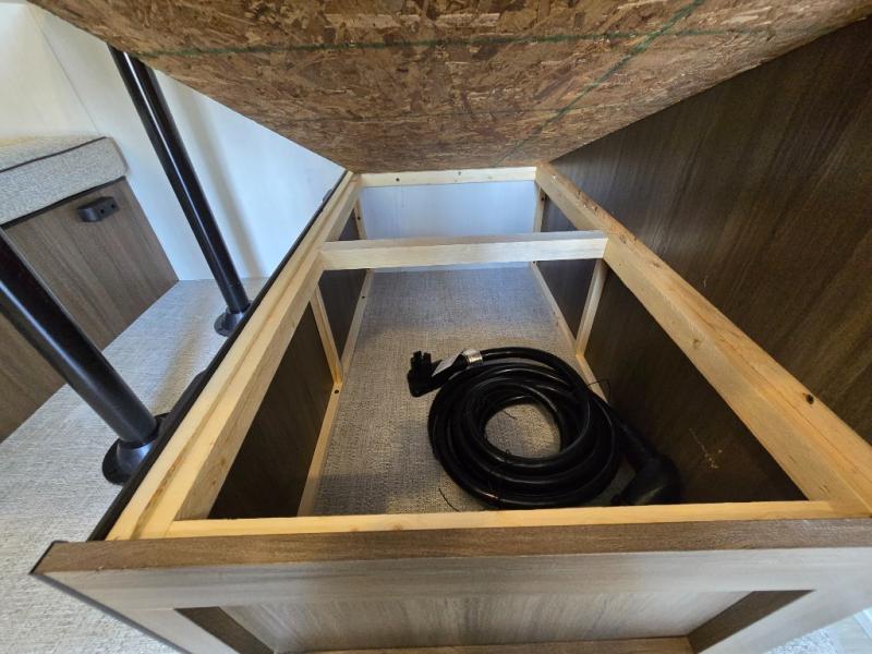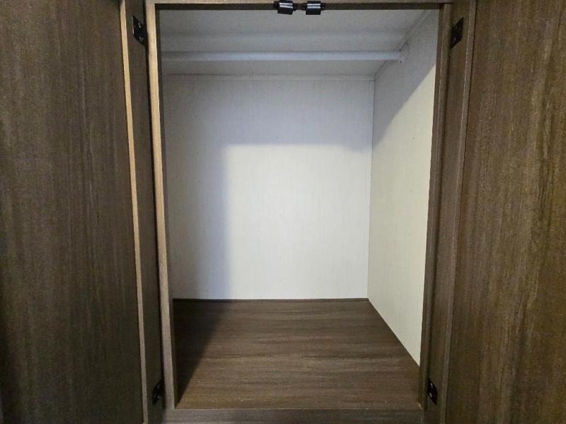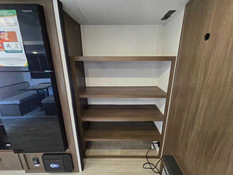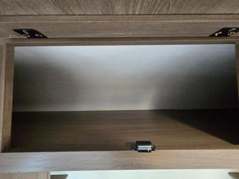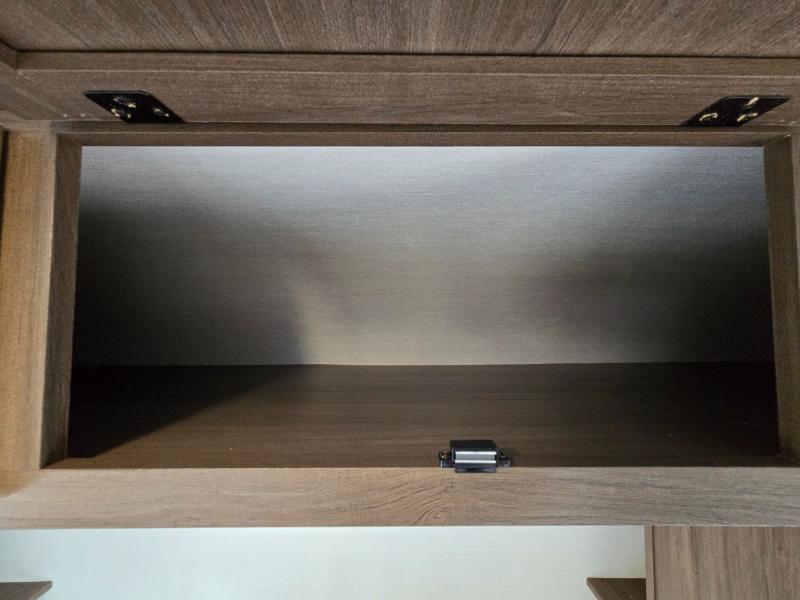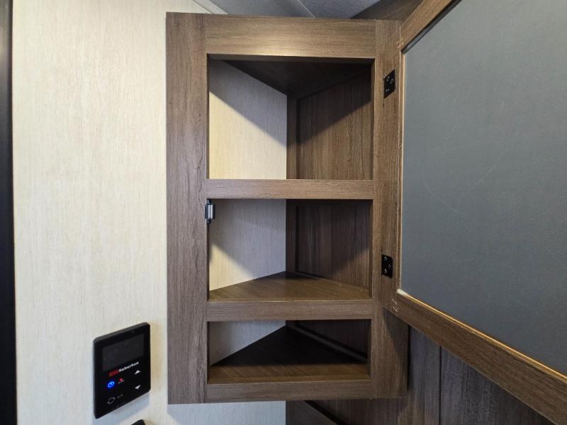 Large pantry, 12V refrigerator, and LED accent lighting.