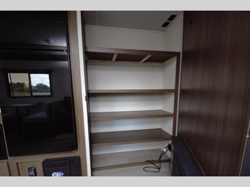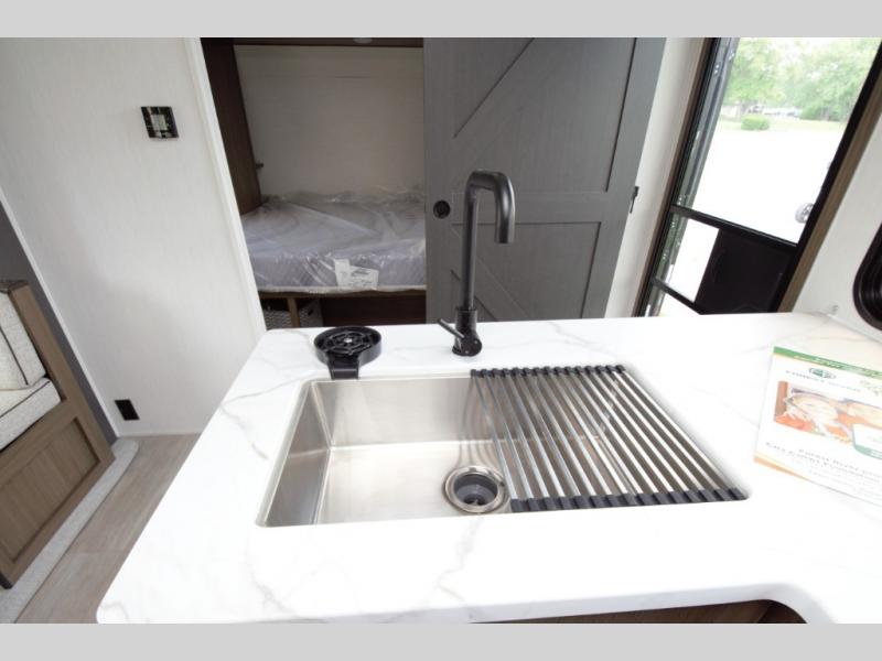 Featuring a flush-mount stainless steel sink, large pantry, 12V refrigerator, and sleek LED lighting. -