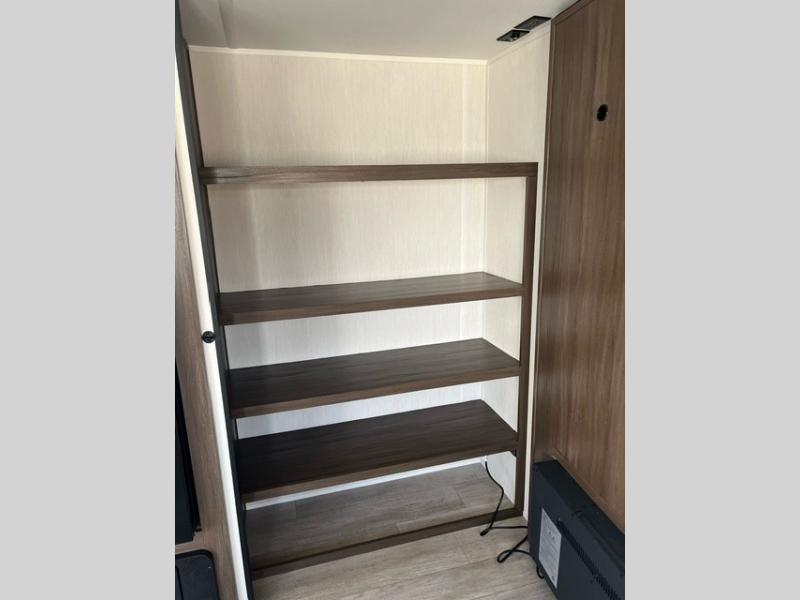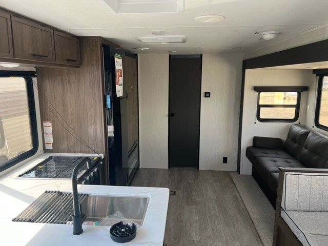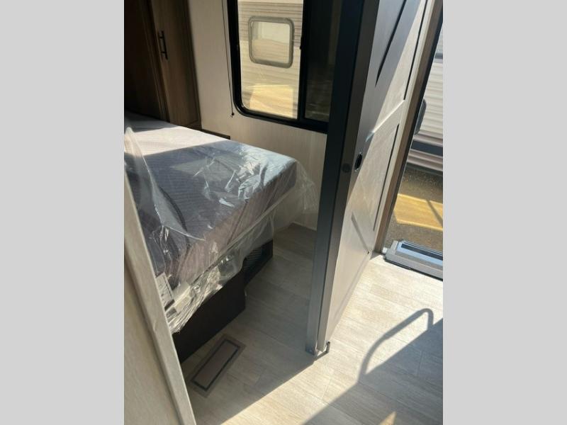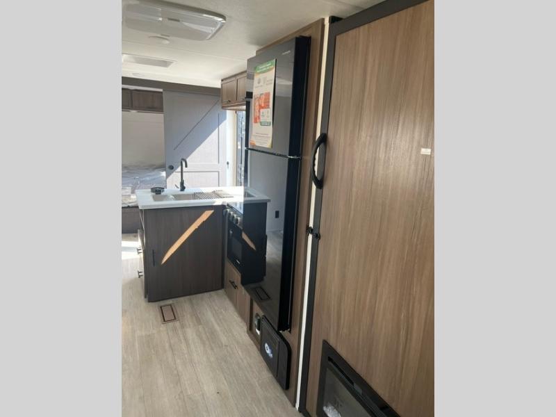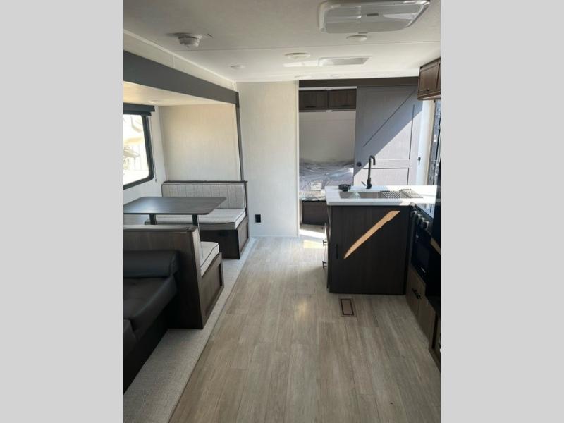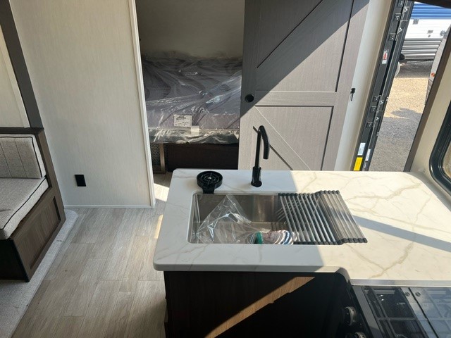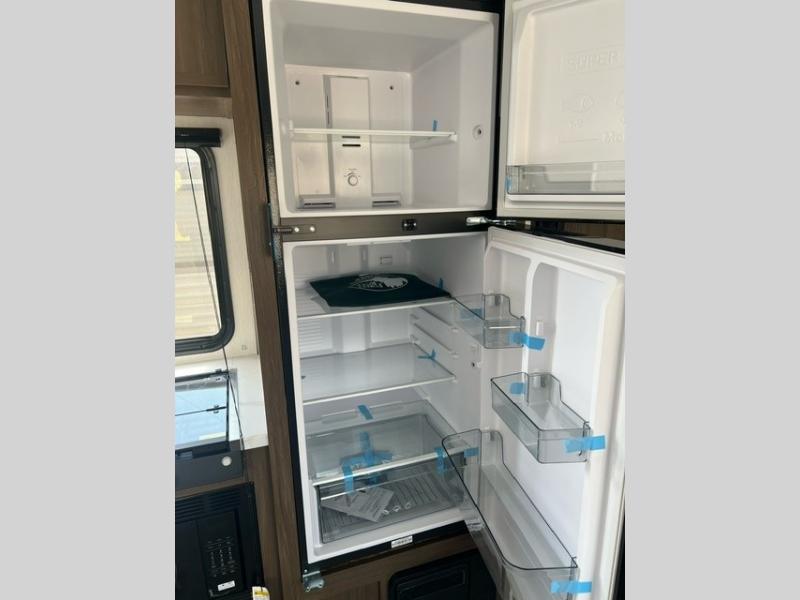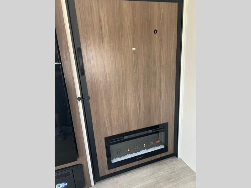 This tandem axle travel trailer is made spacious thanks to the large slide out, which houses the sofa and booth dinette. There is a full rear bath, complete with a tub/shower to make bath time easier than ever if you have little ones. A three burner stovetop and air fryer microwave oven will let you make meals for your crew, and there is a 10.6 cu. ft. 12V refrigerator to keep food fresh. The entertainment center with a fireplace features a hidden pantry behind it for movies, snacks and more! When you're ready for bed, the camp king bed with an ottoman underneath will provide a great night's rest, and there are dual bedside wardrobes to keep your things tidy!