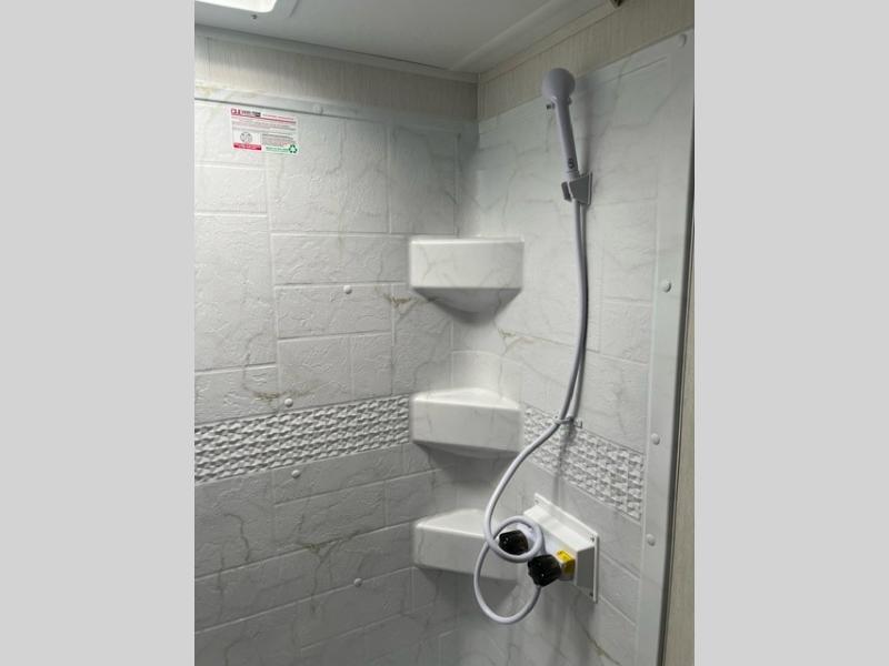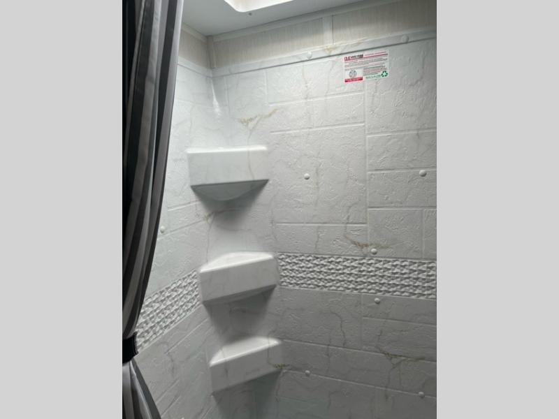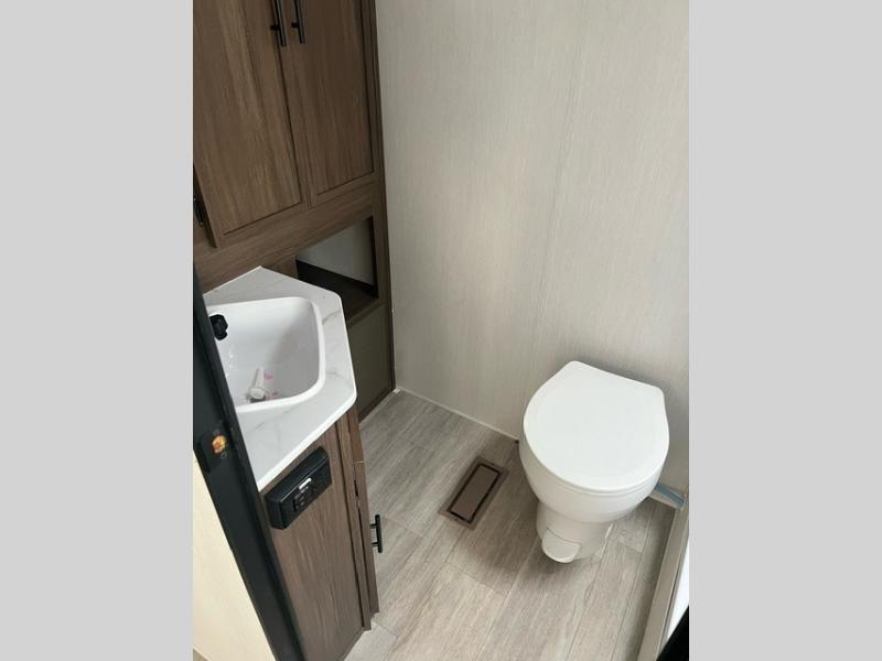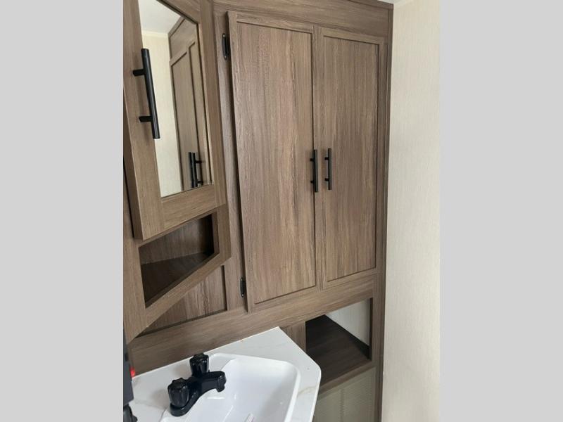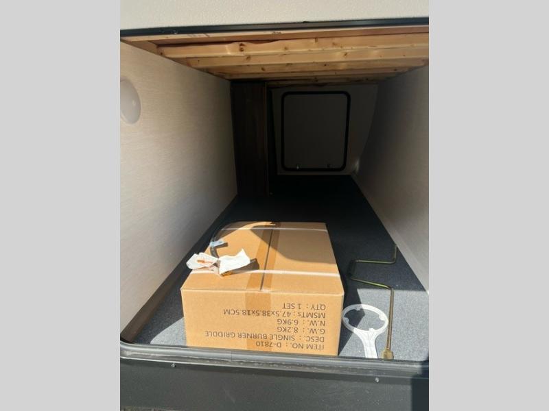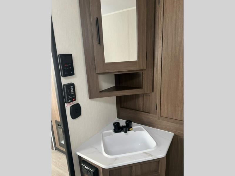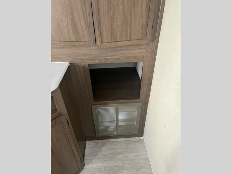 This tandem axle travel trailer is made spacious thanks to the large slide out, which houses the sofa and booth dinette. There is a full rear bath, complete with a tub/shower to make bath time easier than ever if you have little ones. A three burner stovetop and air fryer microwave oven will let you make meals for your crew, and there is a 10.6 cu. ft. 12V refrigerator to keep food fresh. The entertainment center with a fireplace features a hidden pantry behind it for movies, snacks and more! When you're ready for bed, the camp king bed with an ottoman underneath will provide a great night's rest, and there are dual bedside wardrobes to keep your things tidy!