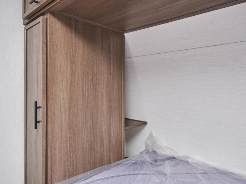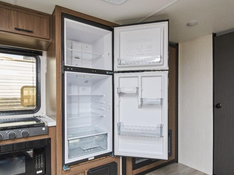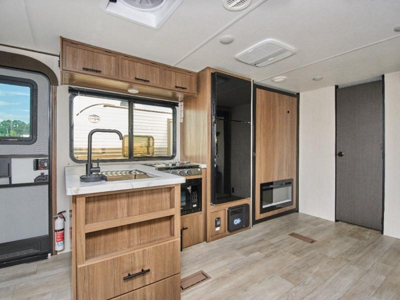Inside, you'll find a camp king bed with an ottoman for extra storage, dual bedside wardrobes, and a full rear bath featuring a tub/shower combo—ideal for families with kids. The kitchen is equipped with a three-burner cooktop, air fryer microwave oven, and a 10.6 cu. ft. 12V refrigerator to keep meals fresh and easy. Behind the entertainment center with fireplace, a hidden pantry provides extra space for snacks, games, or movie night essentials.