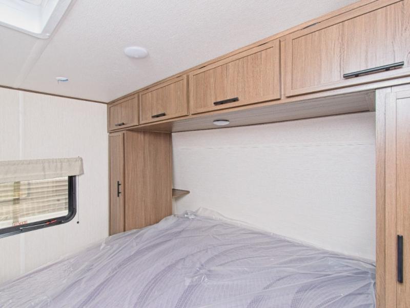 Retreat to your private master bedroom with a walk-around Camp-King bed, dual wardrobes, and direct access to the bathroom. Outside, enjoy the power awning with LED lighting, solid entry steps, and pass-through storage for all your camping essentials. The outdoor mini fridge keeps drinks within reach, and the leash latch ensures your pet stays safe while you relax.