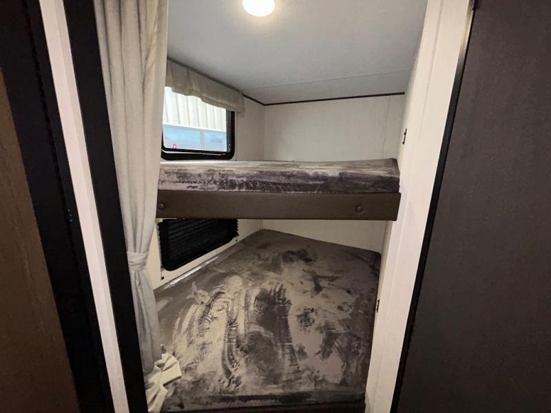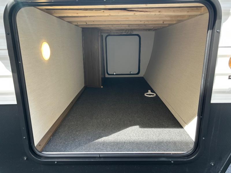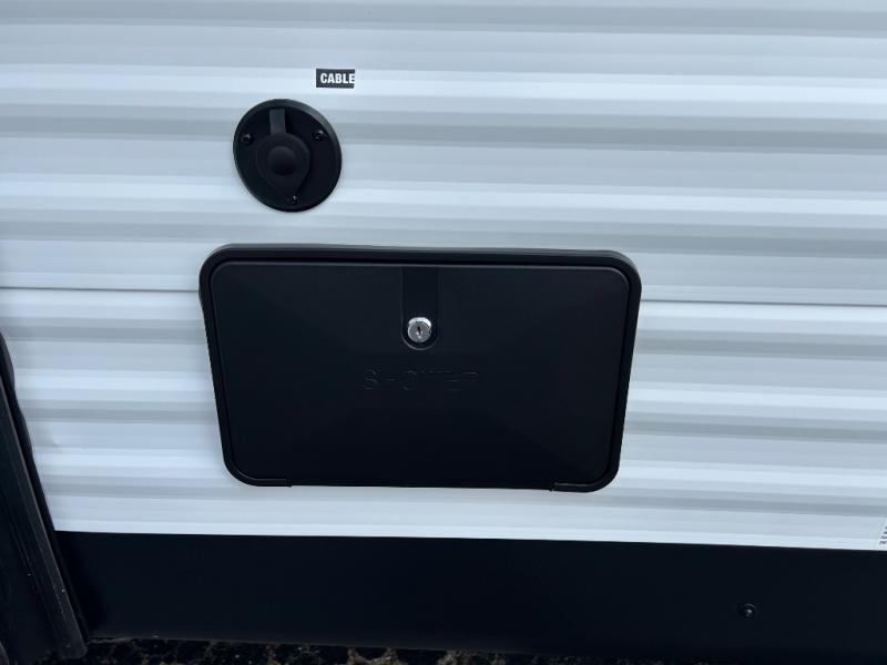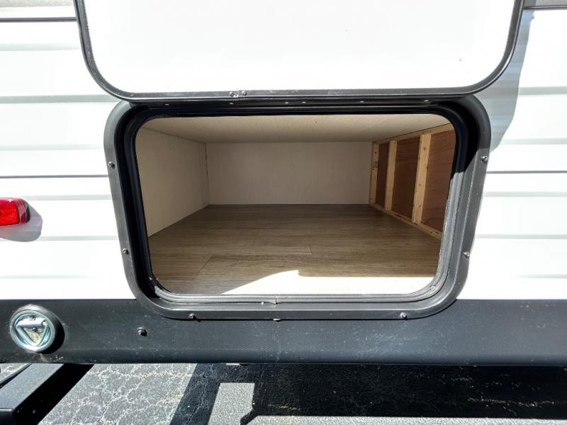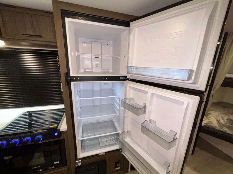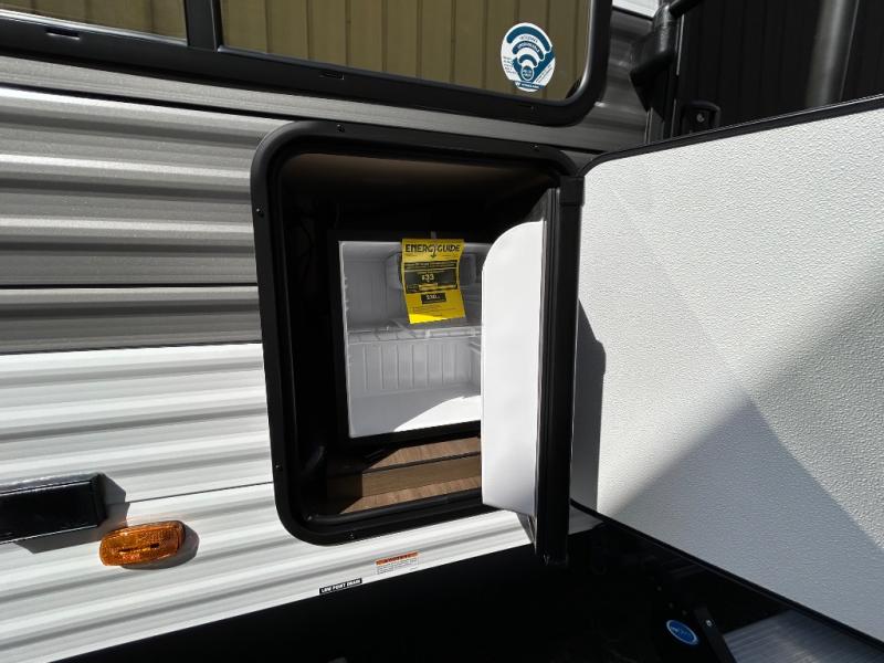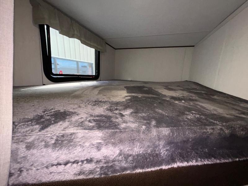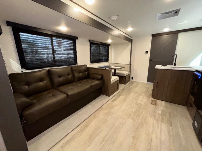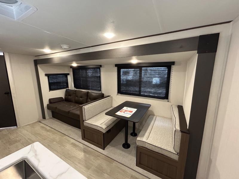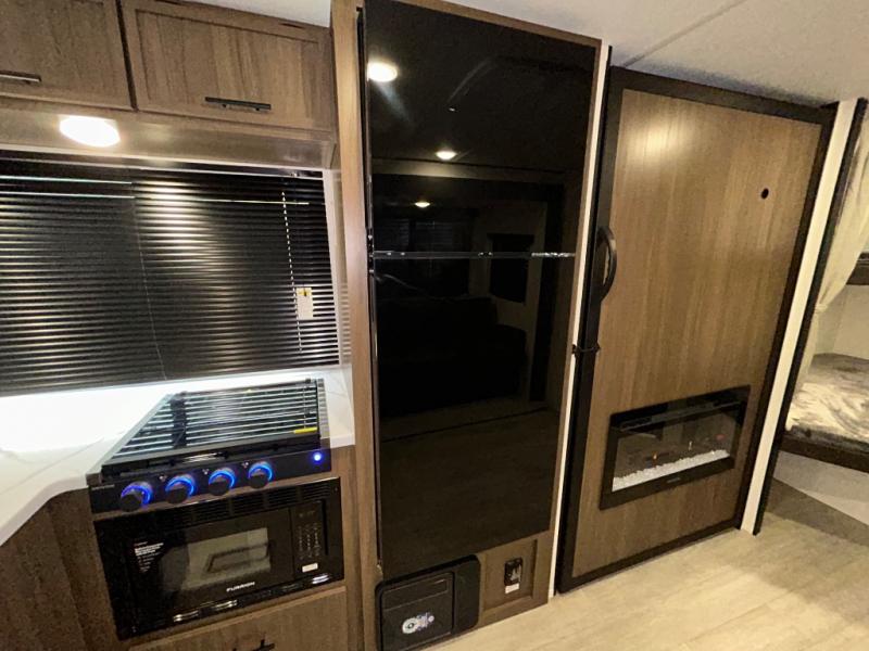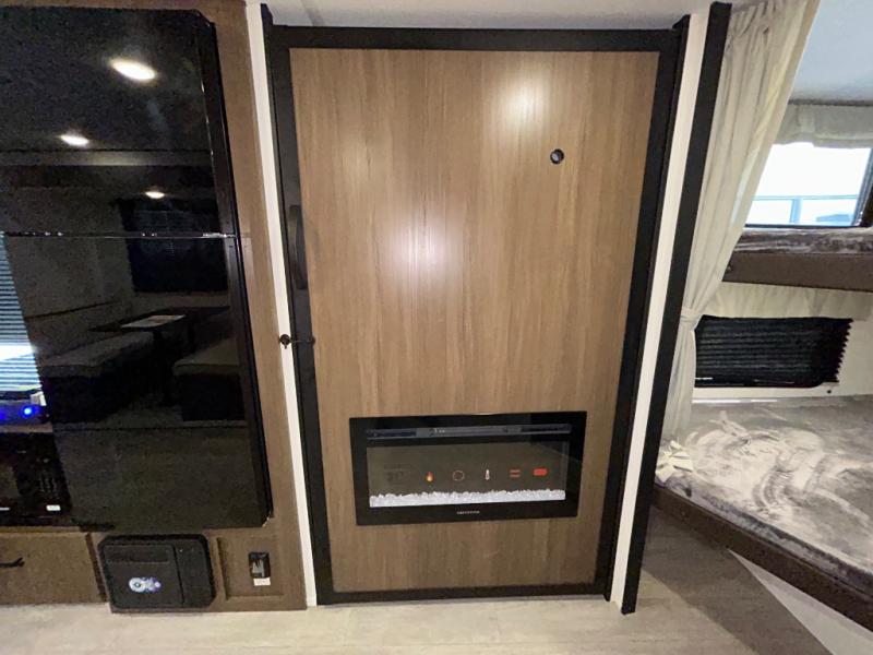 This tandem axle travel trailer is made spacious thanks to the large slide out, which houses the sofa and booth dinette. The layout is similar to model 26RBXC, but you'll enjoy the added double-size bunks in this unit, with a full bath right next to the bunks for easy nighttime use. A three burner stovetop and air fryer microwave oven will let you make meals for your crew, and there is a 10.6 cu. ft. 12V refrigerator to keep food fresh. The entertainment center with a fireplace features a hidden pantry behind it for movies, snacks and more! When you're ready for bed, the camp king bed with an ottoman underneath will provide a great night's rest, and there are dual bedside wardrobes to keep your things tidy! Outside, you'll find a mini refrigerator, a drop frame mega pass-through storage, plus a rear backup camera to make parking easier than ever!