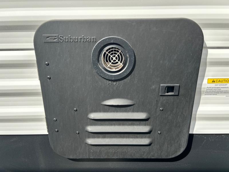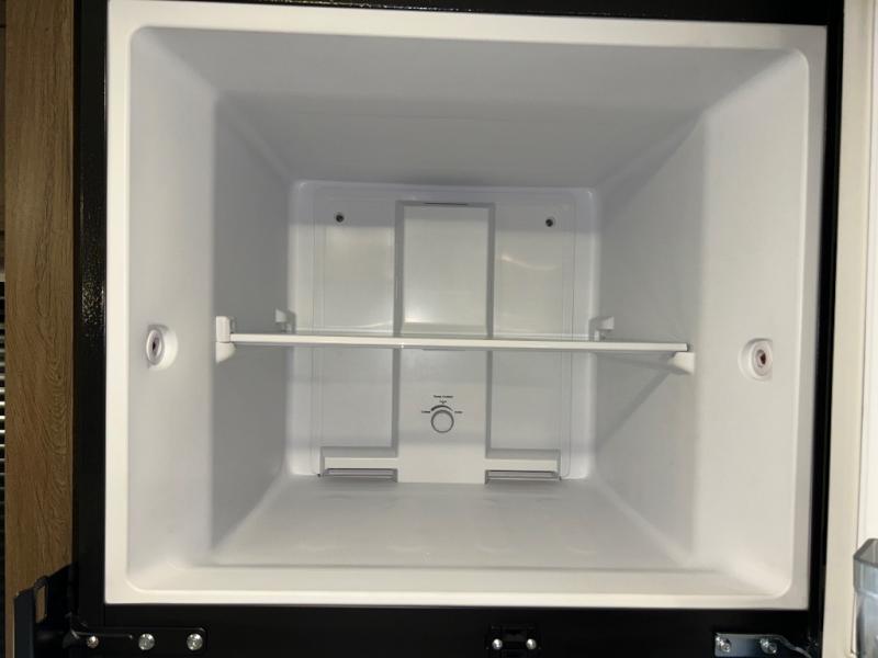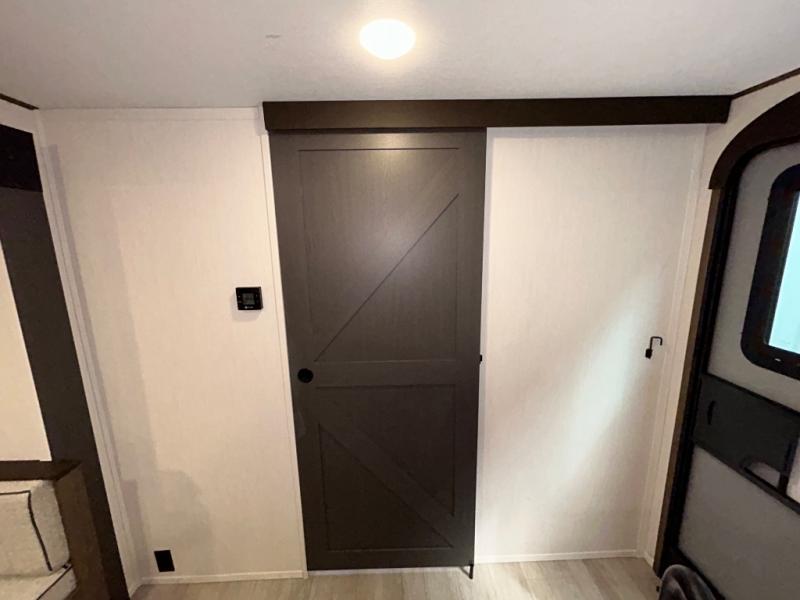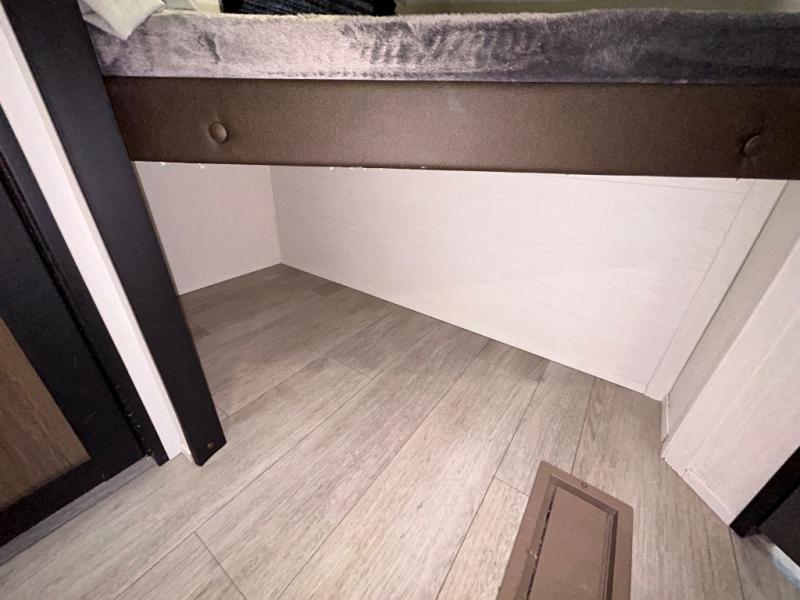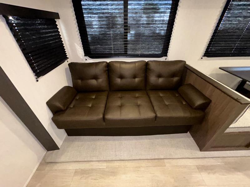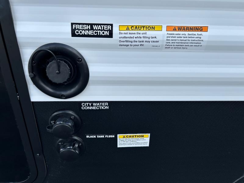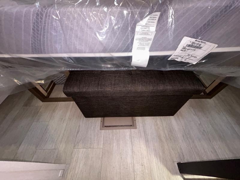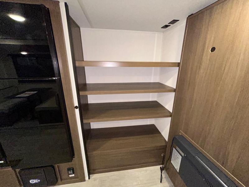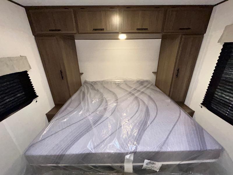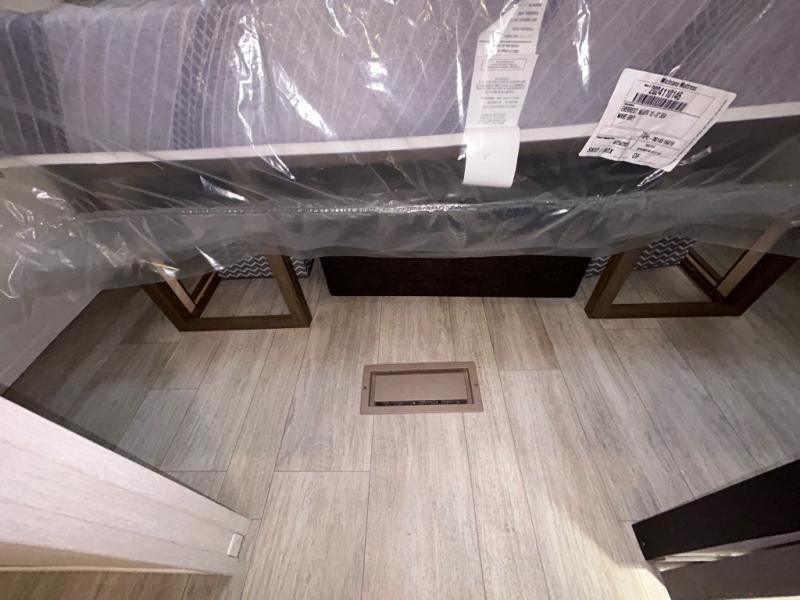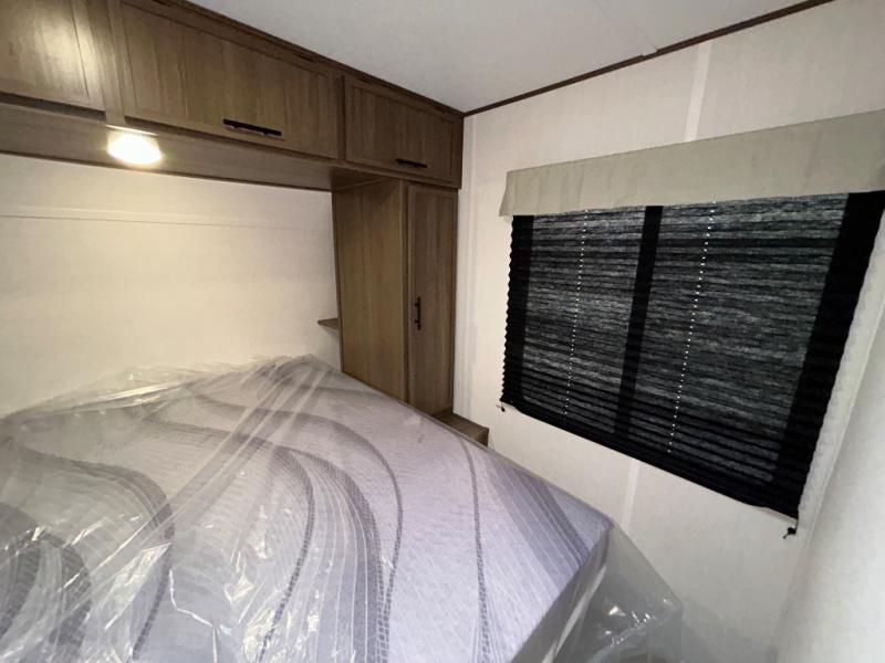 This tandem axle travel trailer is made spacious thanks to the large slide out, which houses the sofa and booth dinette. The layout is similar to model 26RBXC, but you'll enjoy the added double-size bunks in this unit, with a full bath right next to the bunks for easy nighttime use. A three burner stovetop and air fryer microwave oven will let you make meals for your crew, and there is a 10.6 cu. ft. 12V refrigerator to keep food fresh. The entertainment center with a fireplace features a hidden pantry behind it for movies, snacks and more! When you're ready for bed, the camp king bed with an ottoman underneath will provide a great night's rest, and there are dual bedside wardrobes to keep your things tidy! Outside, you'll find a mini refrigerator, a drop frame mega pass-through storage, plus a rear backup camera to make parking easier than ever!