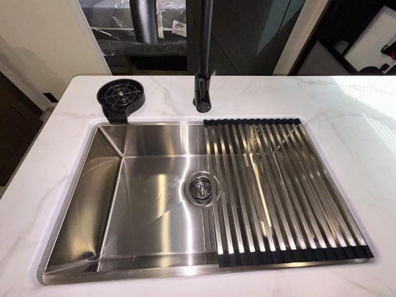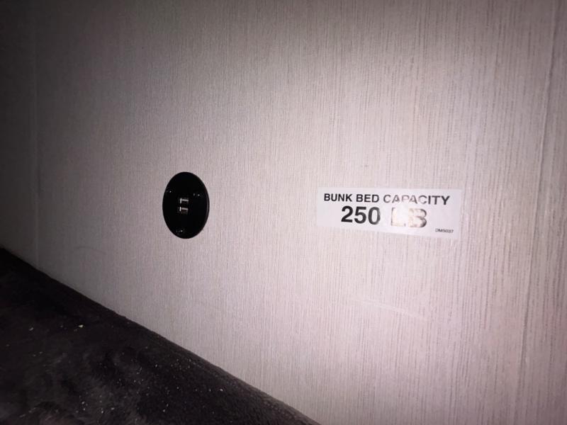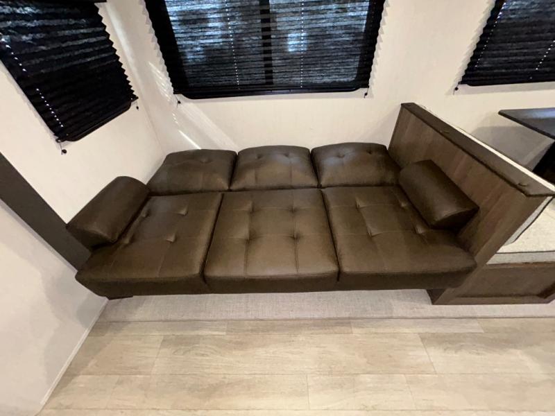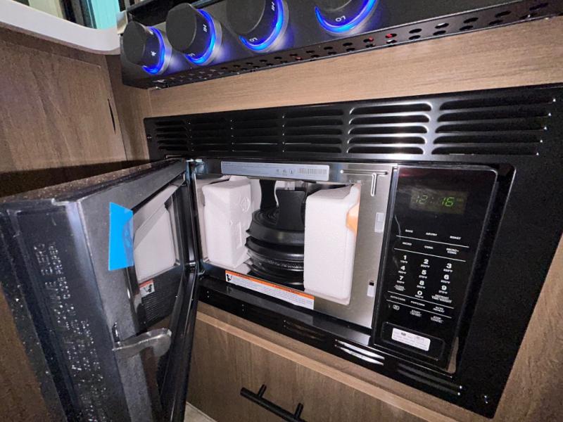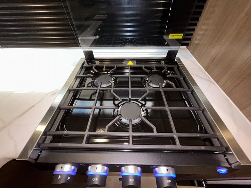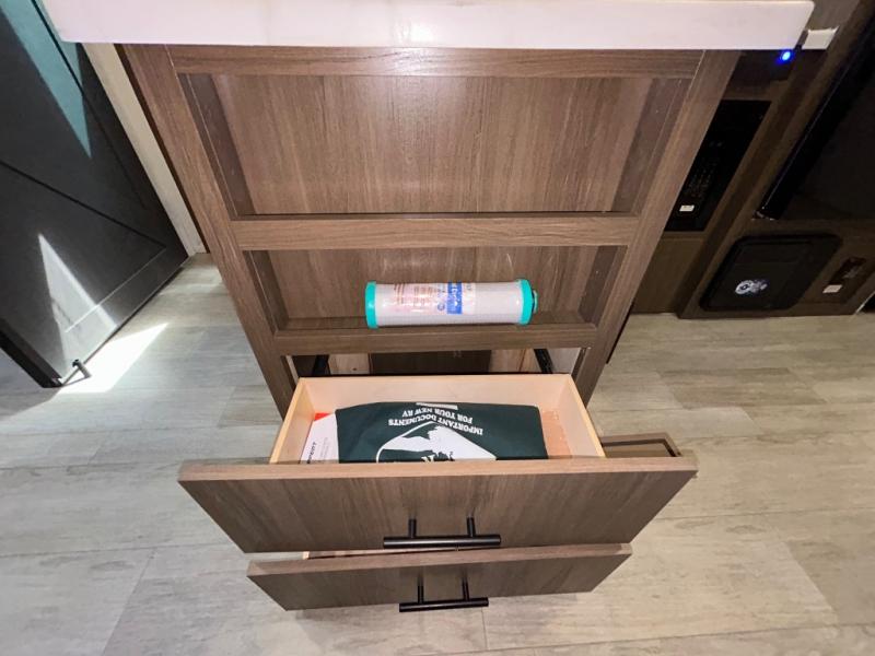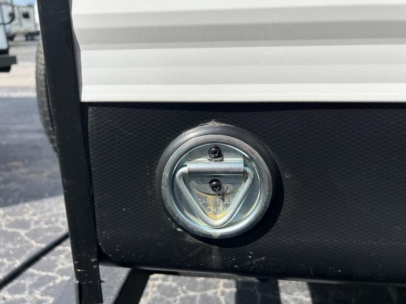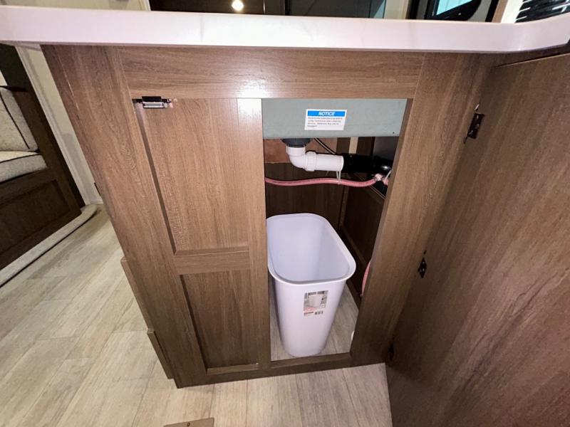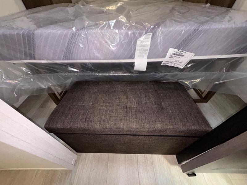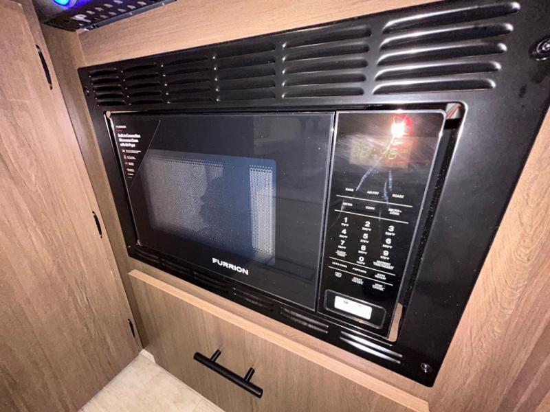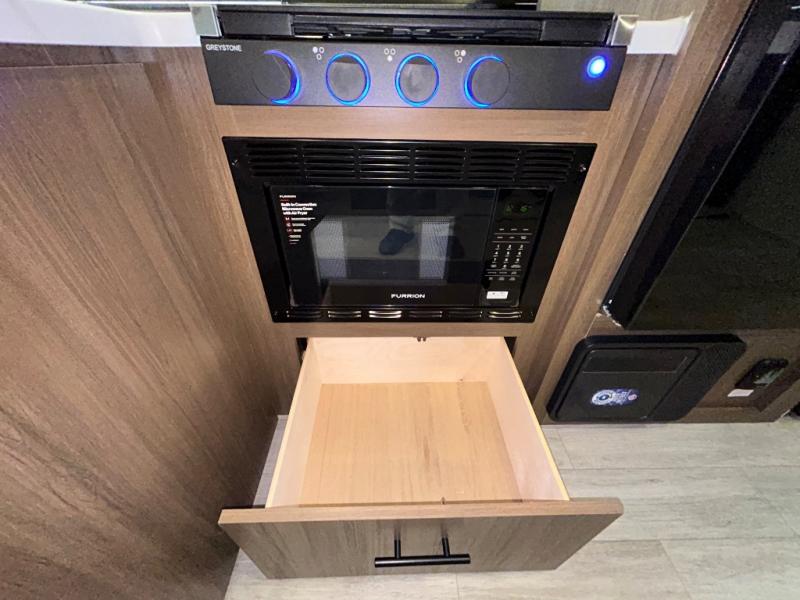 This tandem axle travel trailer is made spacious thanks to the large slide out, which houses the sofa and booth dinette. The layout is similar to model 26RBXC, but you'll enjoy the added double-size bunks in this unit, with a full bath right next to the bunks for easy nighttime use. A three burner stovetop and air fryer microwave oven will let you make meals for your crew, and there is a 10.6 cu. ft. 12V refrigerator to keep food fresh. The entertainment center with a fireplace features a hidden pantry behind it for movies, snacks and more! When you're ready for bed, the camp king bed with an ottoman underneath will provide a great night's rest, and there are dual bedside wardrobes to keep your things tidy! Outside, you'll find a mini refrigerator, a drop frame mega pass-through storage, plus a rear backup camera to make parking easier than ever!