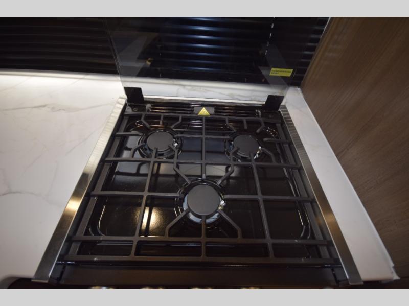 Cooking on the road is a breeze thanks to the three-burner stovetop, air fryer microwave oven, and a 10.6 cu. ft. 12V refrigerator that keeps your meals fresh and ready. Craving a movie night? The entertainment center with a fireplace sets the mood — and don’t miss the hidden pantry behind it, perfect for snacks and supplies.