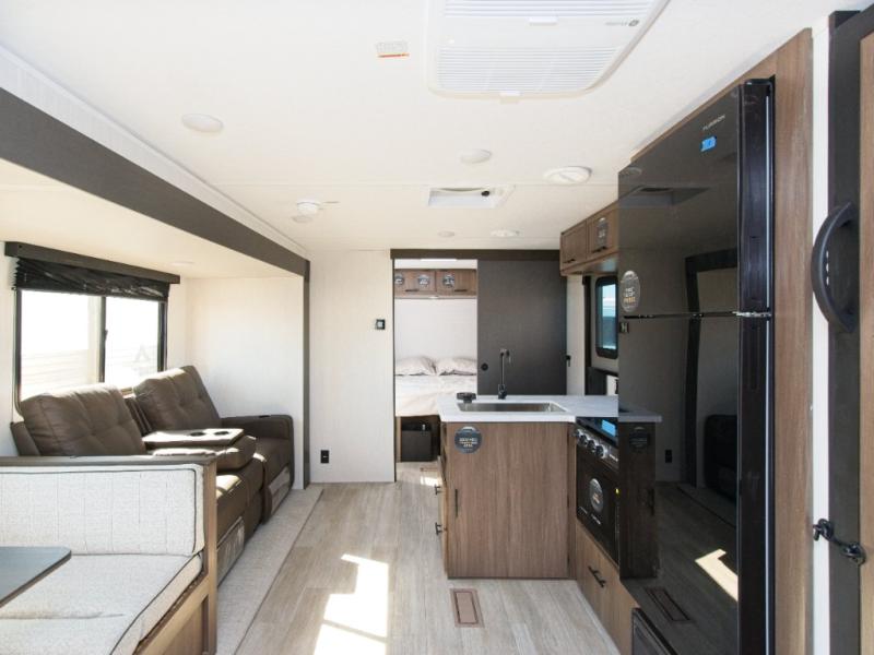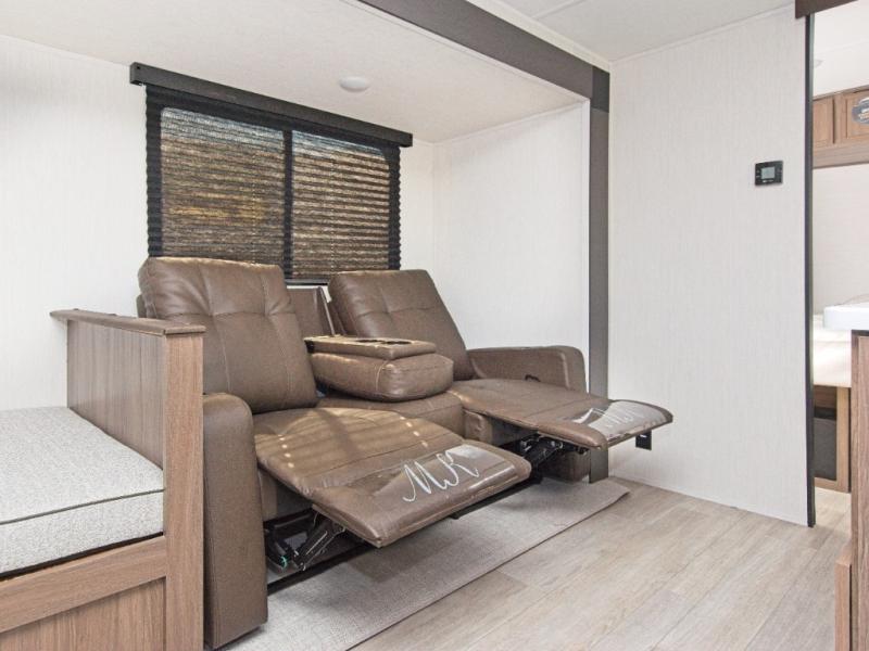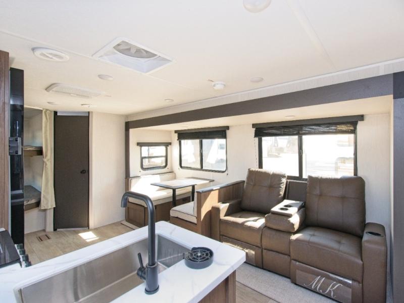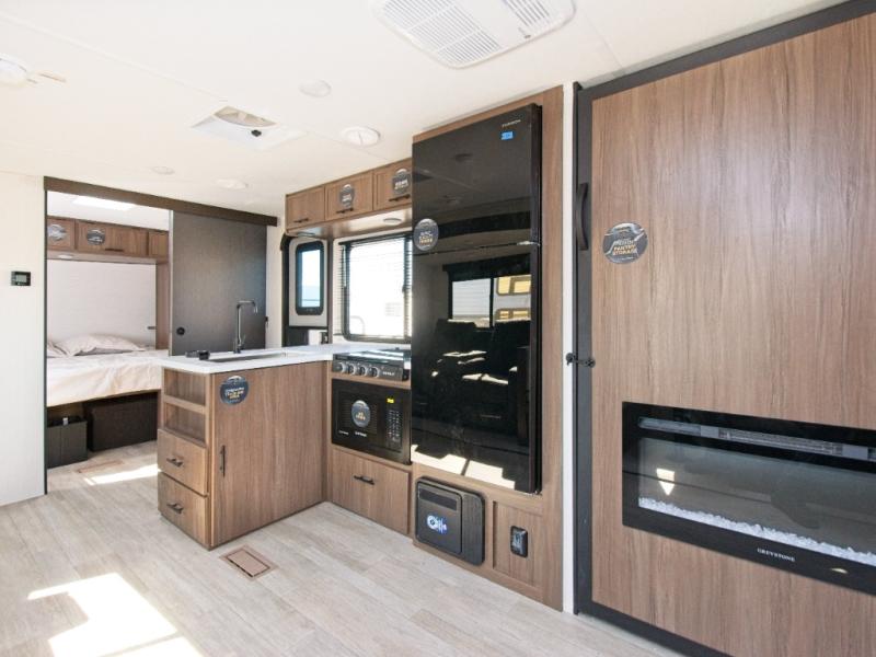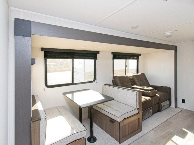 Step inside and enjoy a spacious layout perfect for family camping. The large slide-out creates an open living area with a comfortable sofa and booth dinette. A three-burner stovetop, air fryer microwave oven, and 10.6 cu. ft. 12V refrigerator make meal prep a breeze.