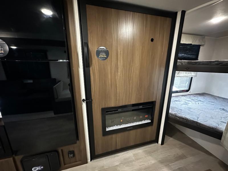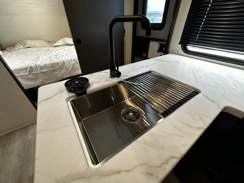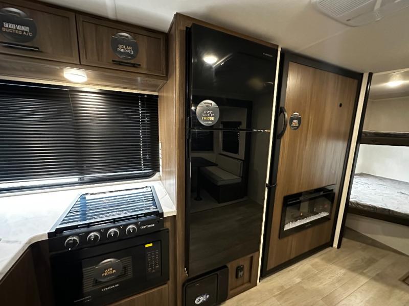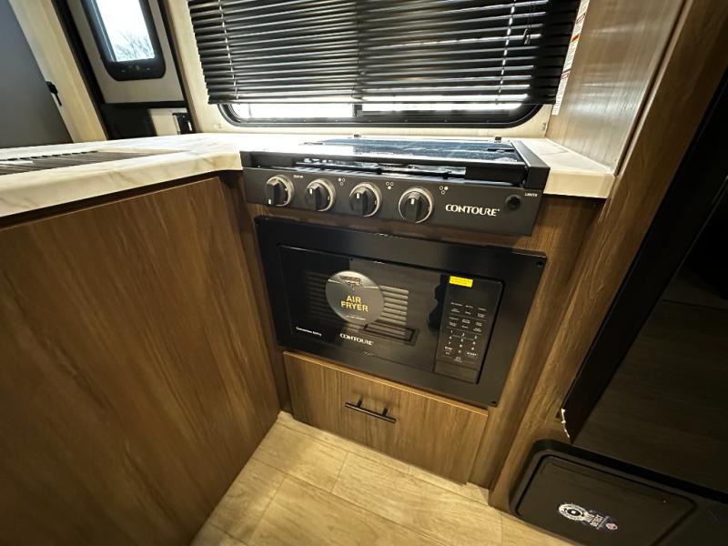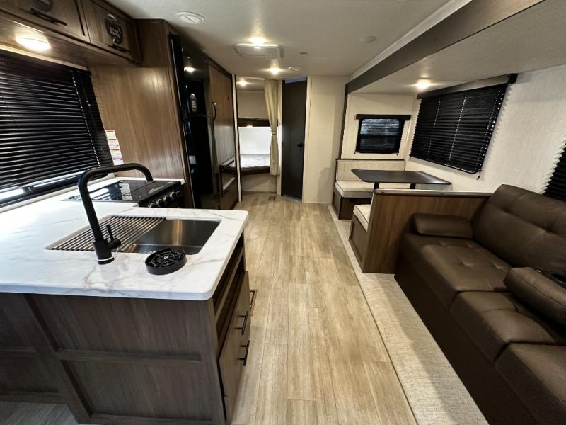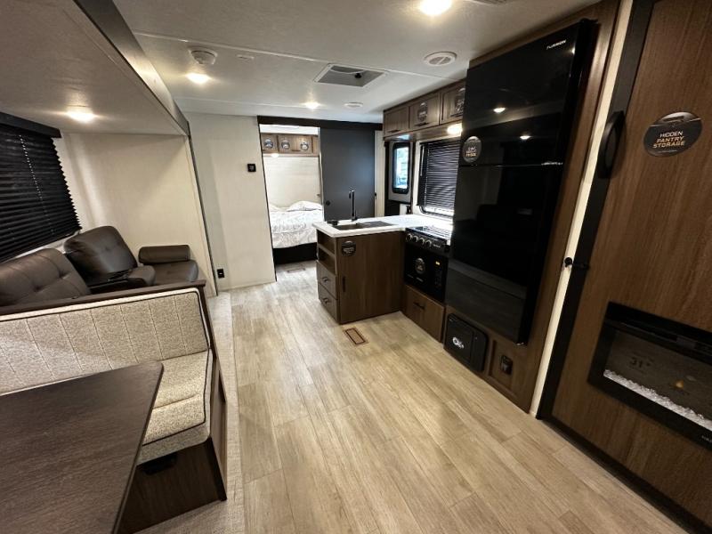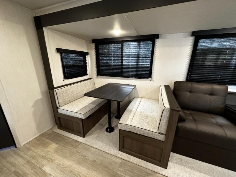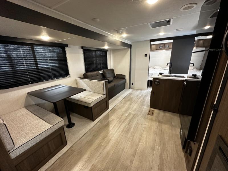 The 27CC offers a spacious interior with thoughtful design elements you’ll appreciate from the moment you walk in. An open-concept living area creates a welcoming space for entertaining or relaxing after a day of adventure. The well-appointed kitchen features quality appliances, ample storage, and a dinette that’s perfect for meals, games, or planning your next route.
