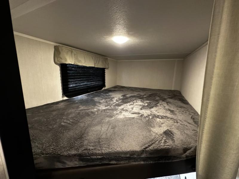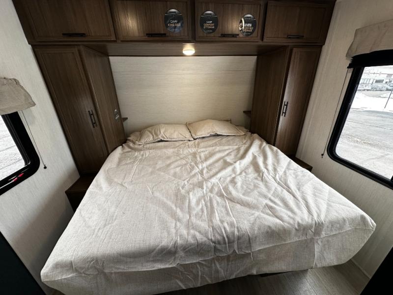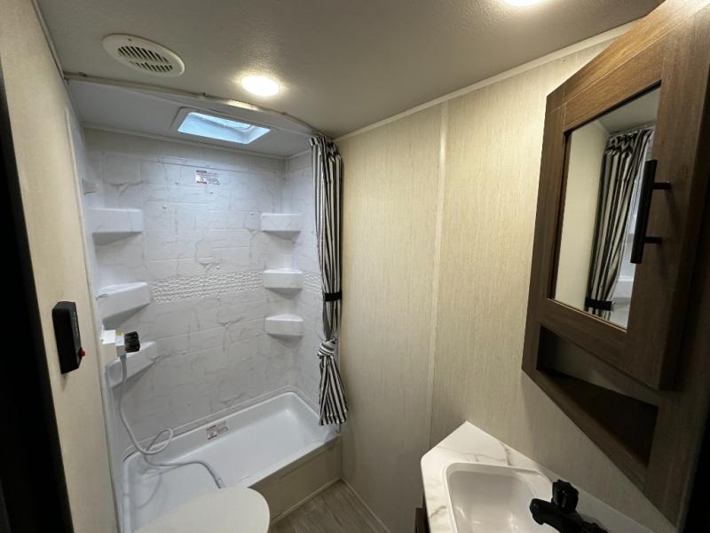 Rest easy in the comfortable private bedroom, complete with cozy sleeping accommodations and smart storage options. The bathroom is conveniently located and equipped with user-friendly fixtures that make your on-the-road routine feel just like home.