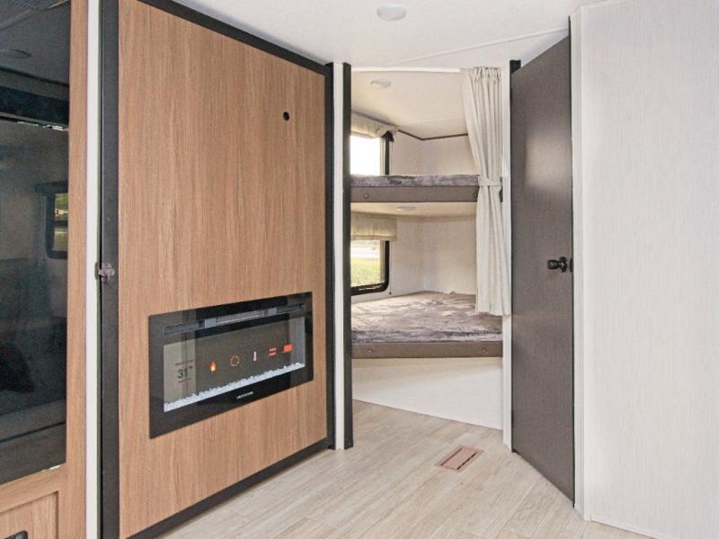 The entertainment center with fireplace adds cozy vibes, and behind it, you’ll find a hidden pantry for snacks and supplies.