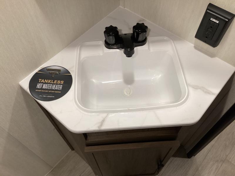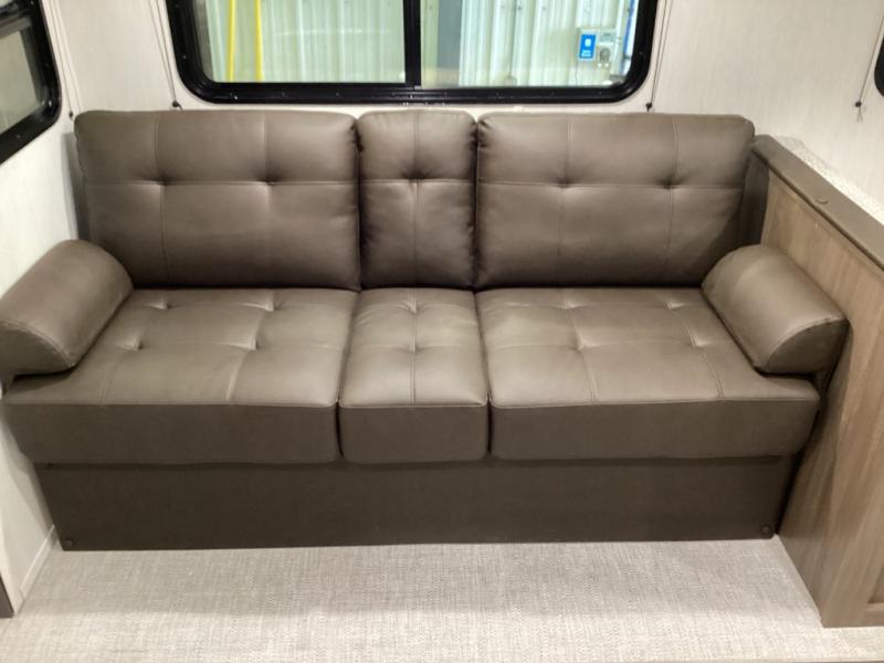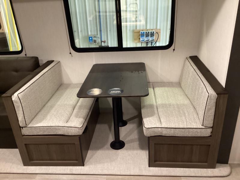 This tandem axle travel trailer is made spacious thanks to the large slide out, which houses the sofa and booth dinette.
