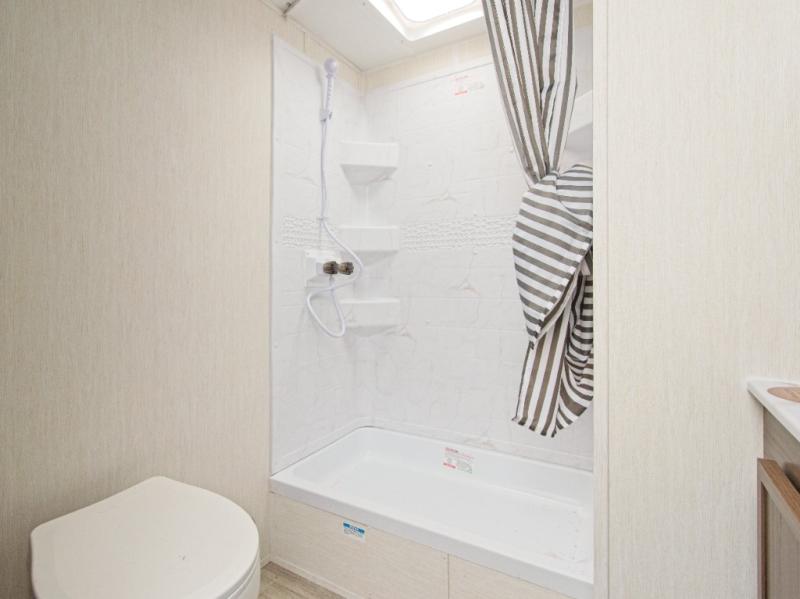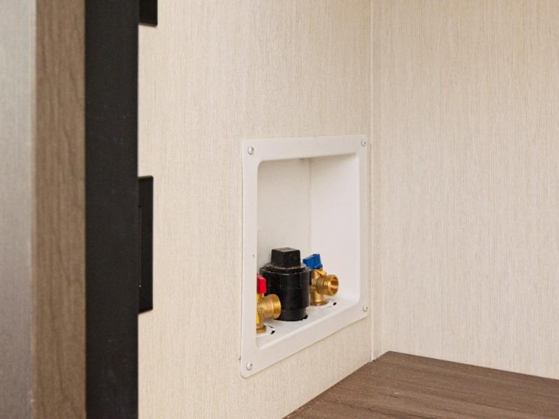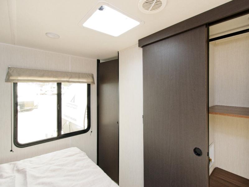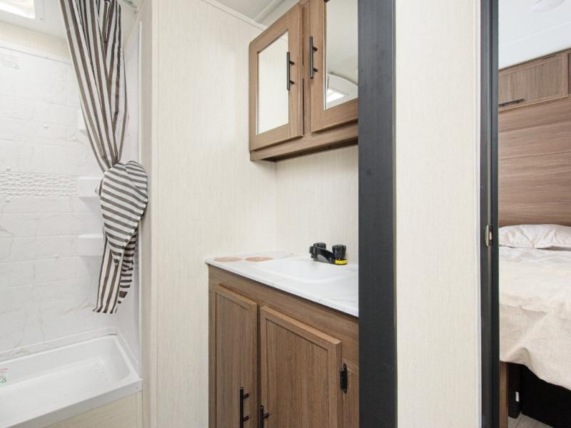 Moving toward the front, the full mid-bath features a spacious shower, toilet, sink, and medicine cabinet to keep everything organized and accessible. The private front bedroom offers a relaxing retreat with a camp king bed, a convenient ottoman underneath for extra storage, and dual bedside wardrobes. A third wardrobe includes washer and dryer prep, giving you the option to add even more at-home convenience.