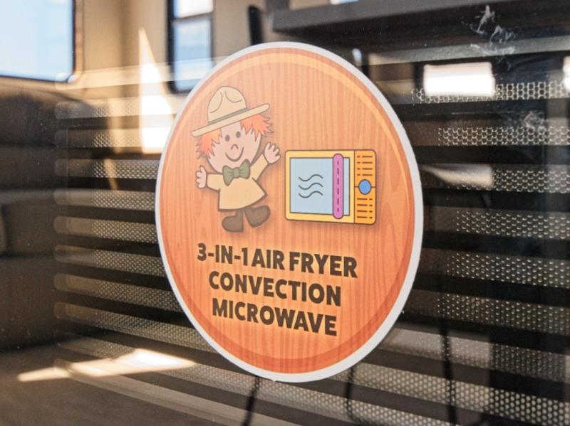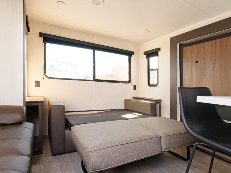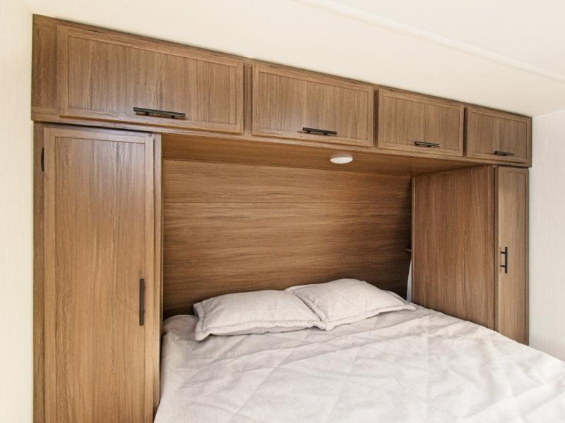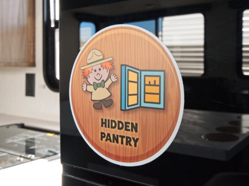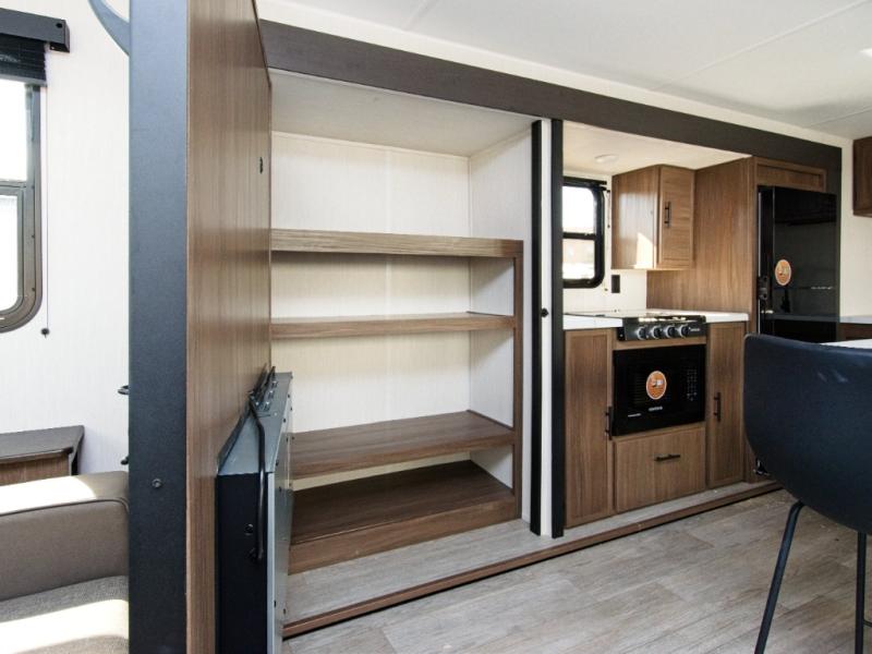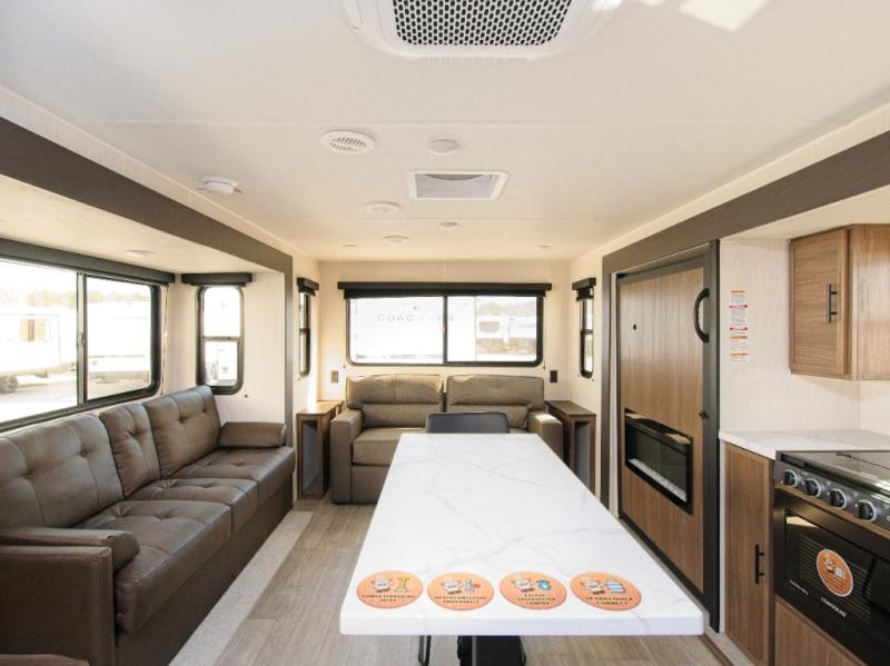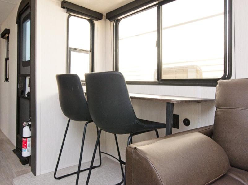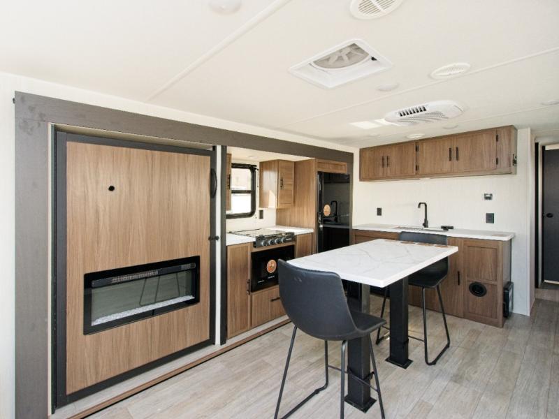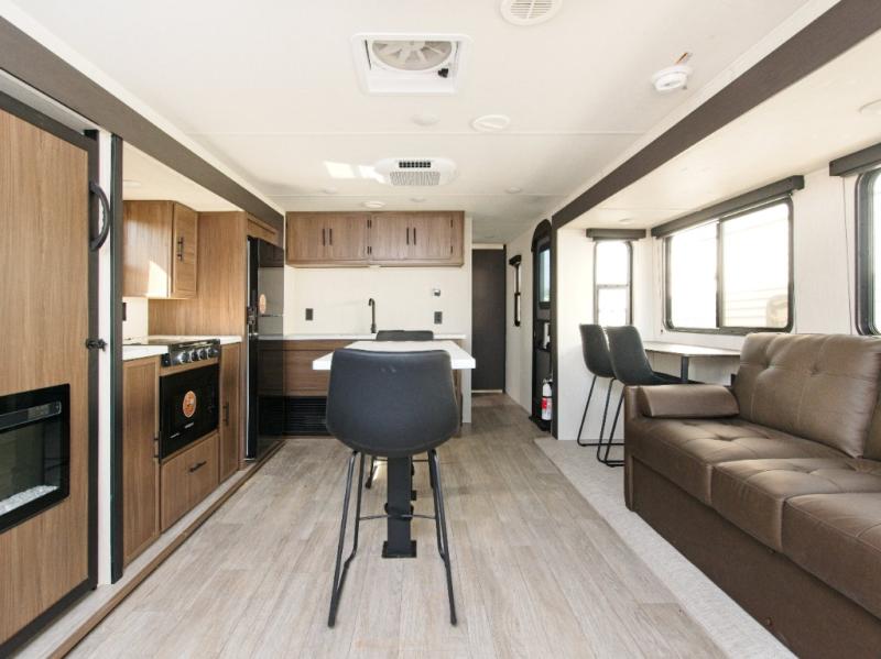 Prepare meals with ease and gather around the center farm-style dining table with seating for four, while two plush sofas provide additional lounging space. Need to work while on the road? A dedicated desk with chair makes remote work at the campground simple and comfortable. The hidden pantry tucked behind the entertainment center keeps food, games, and movies neatly stored, while the built-in fireplace adds warmth and ambiance.