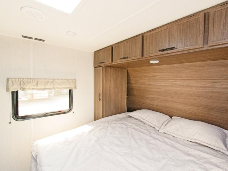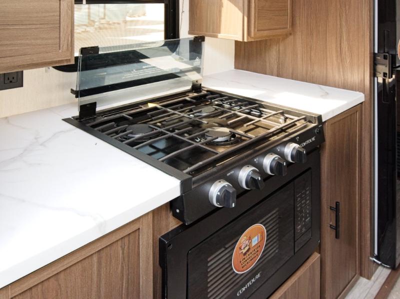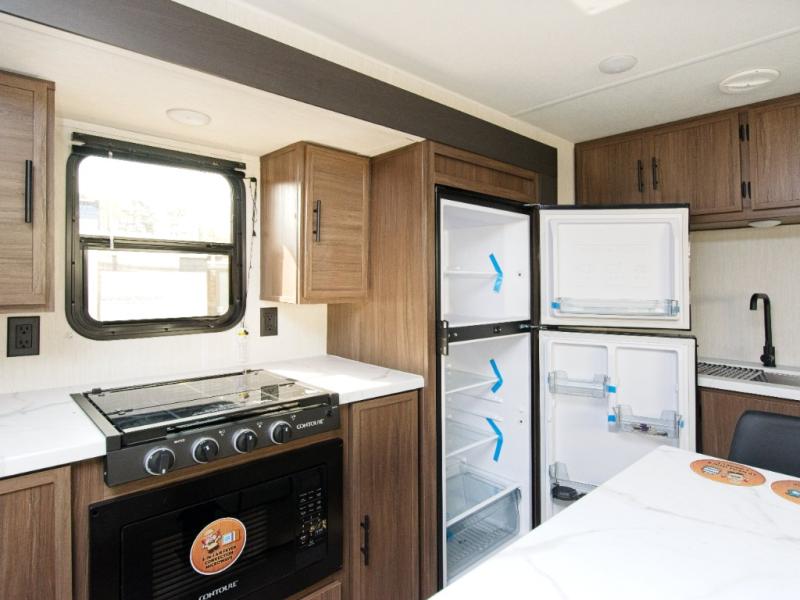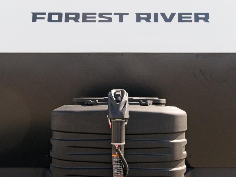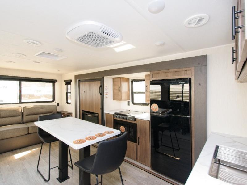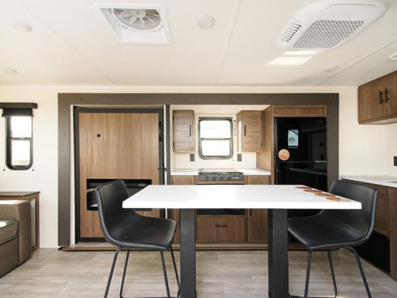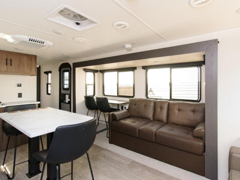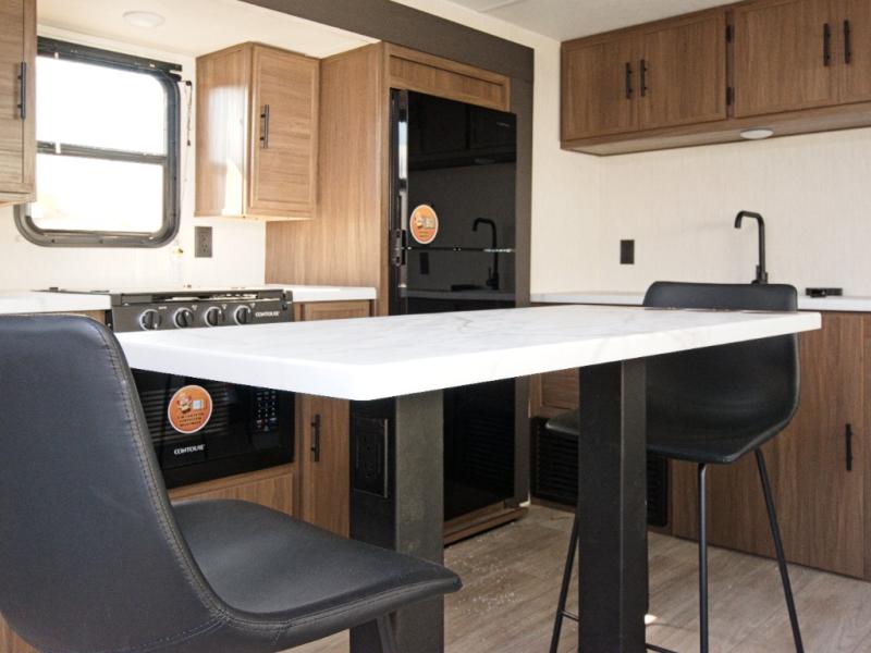 Stay comfortable year-round with a tankless water heater for on-demand hot water and a 15,000 BTU ducted air conditioner to beat the summer heat. Inside, enjoy stylish and durable finishes like seamless Congoleum flooring, pleated nightshades, and thermofoil pressed countertops that bring both elegance and easy maintenance to your RV lifestyle.