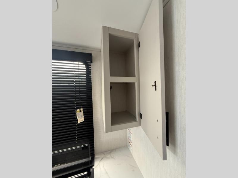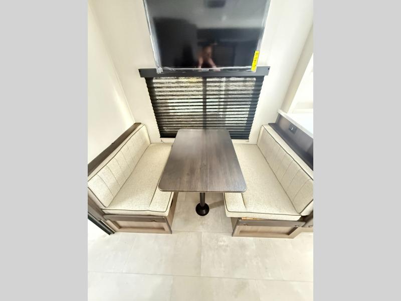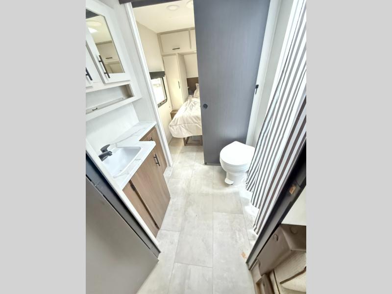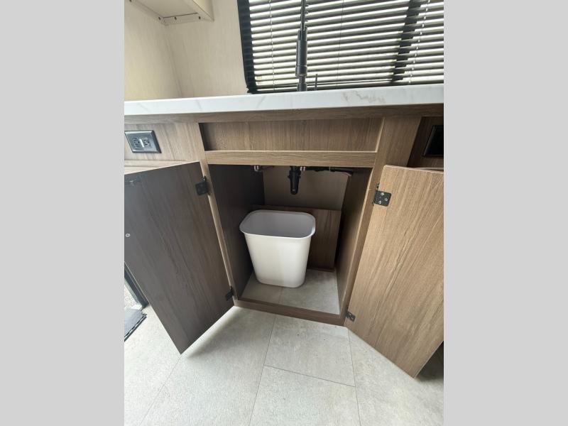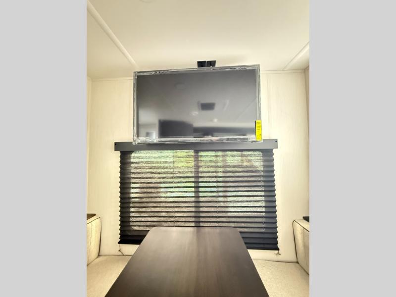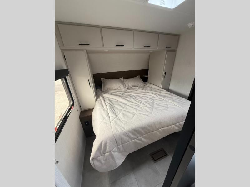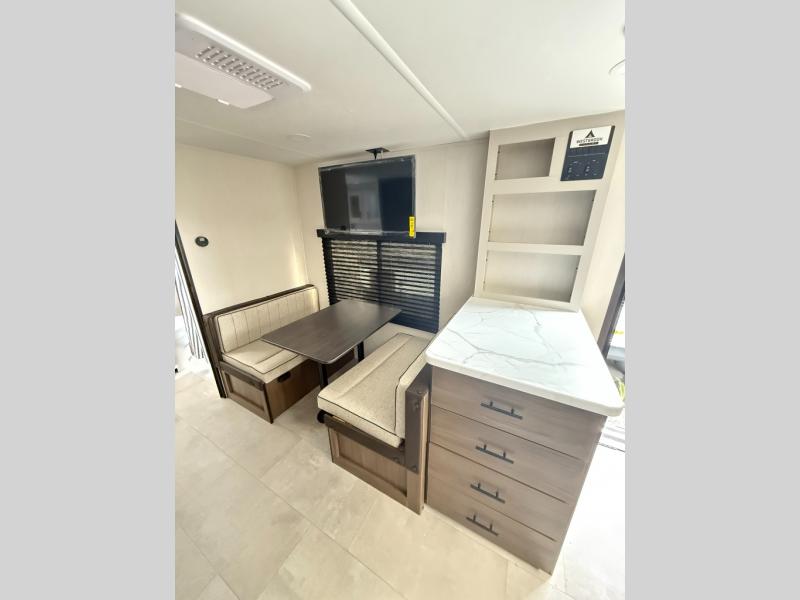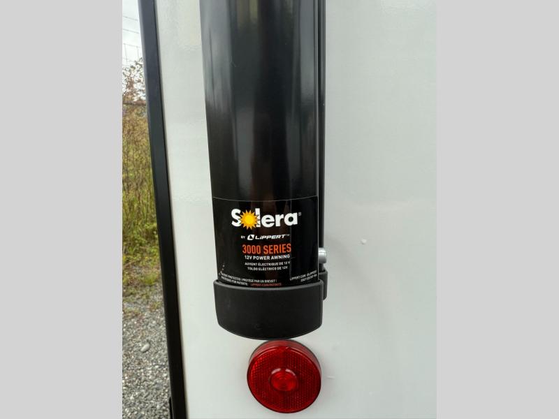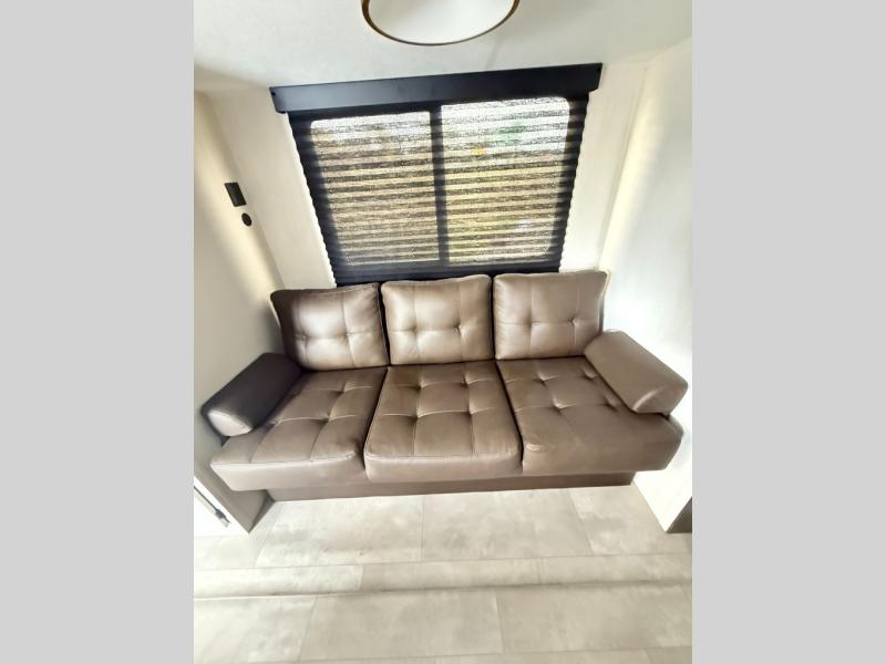 This model is built for easy towing and big adventure. With a tankless water heater, 12 volt refrigerator, and integrated LED awning lights, it combines everyday convenience with camping luxury. Its bunk beds and queen bed setup make it a great fit for families or guests.