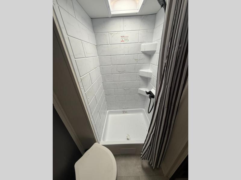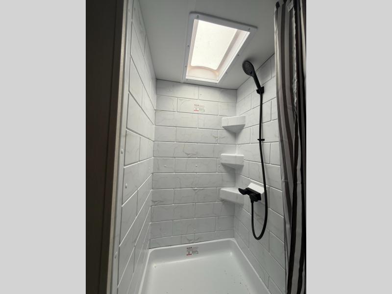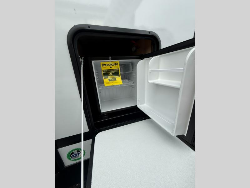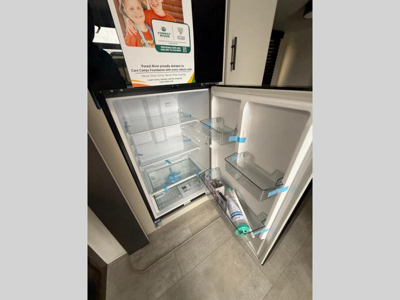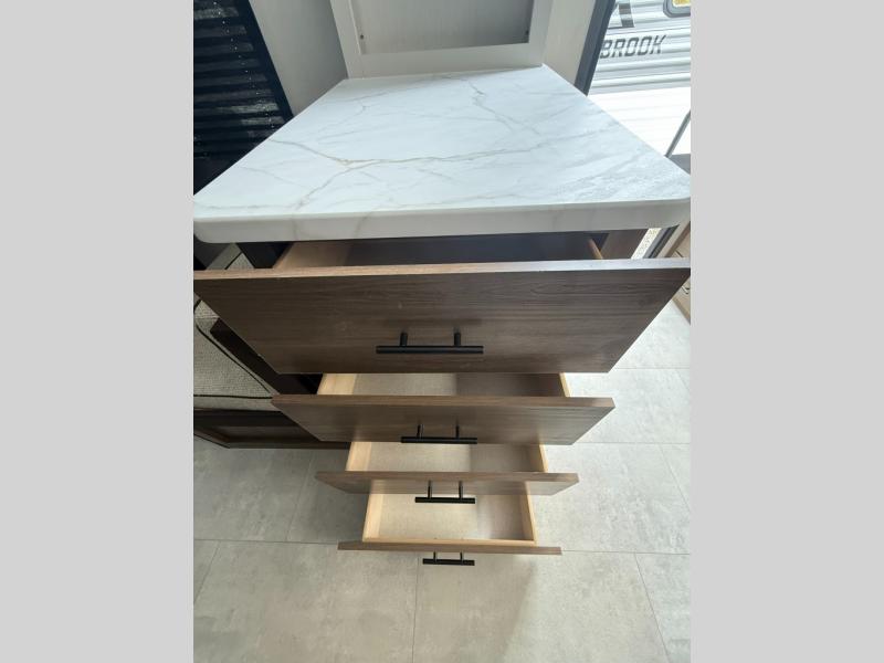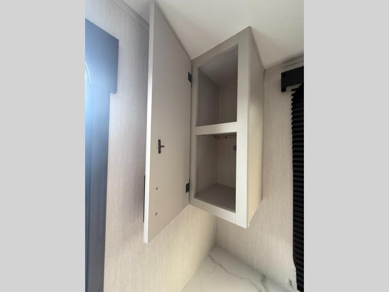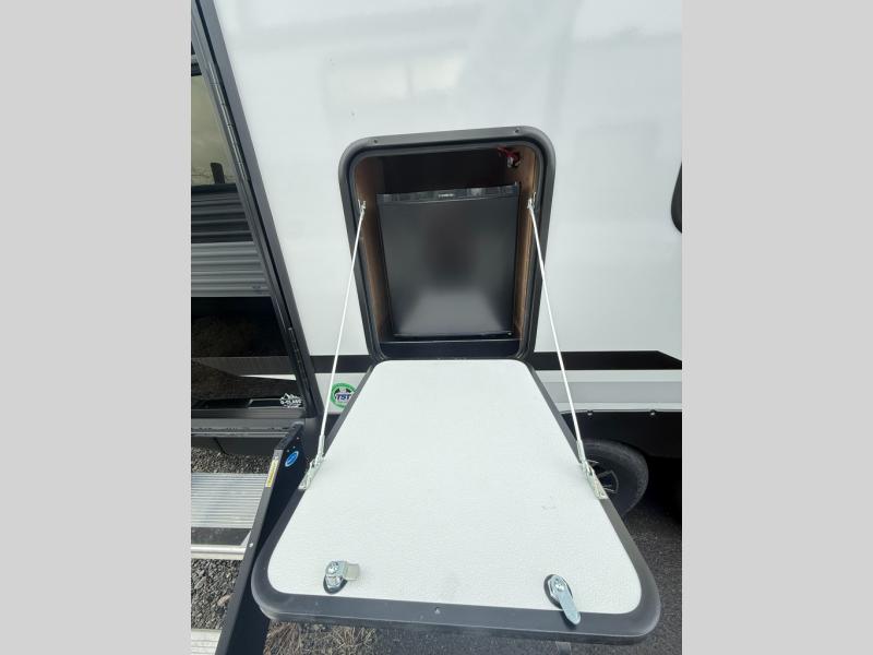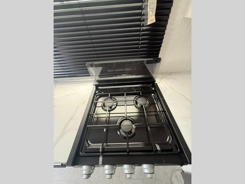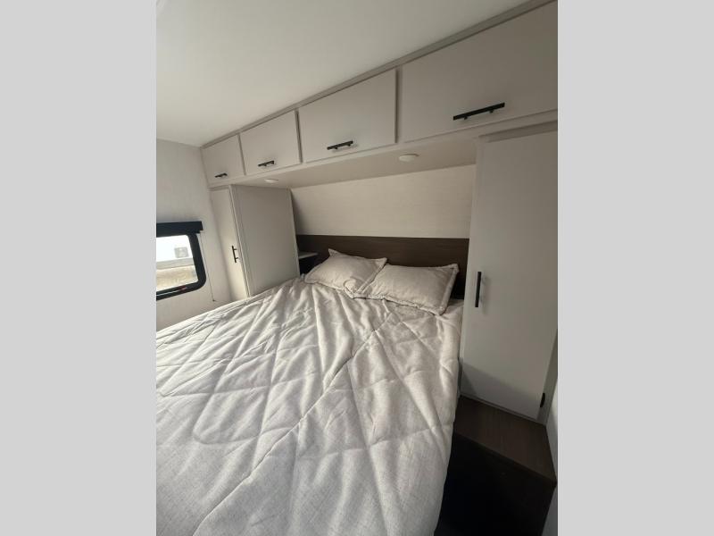 This model is built for easy towing and big adventure. With a tankless water heater, 12 volt refrigerator, and integrated LED awning lights, it combines everyday convenience with camping luxury. Its bunk beds and queen bed setup make it a great fit for families or guests.