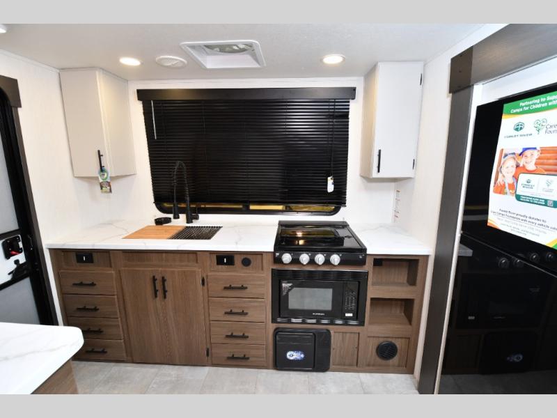 Inside, the 245RKLC features a thoughtfully designed floorplan with a spacious living area, fully equipped kitchen, and private bedroom. Outside, the flip-down travel rack provides extra storage for bikes or gear, while the loose outside griddle makes campsite cooking fun and flexible. Every detail is designed to enhance your travel experience, so you can focus on enjoying every mile of your journey.