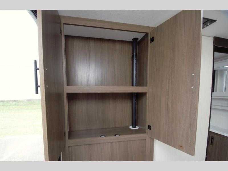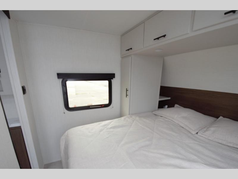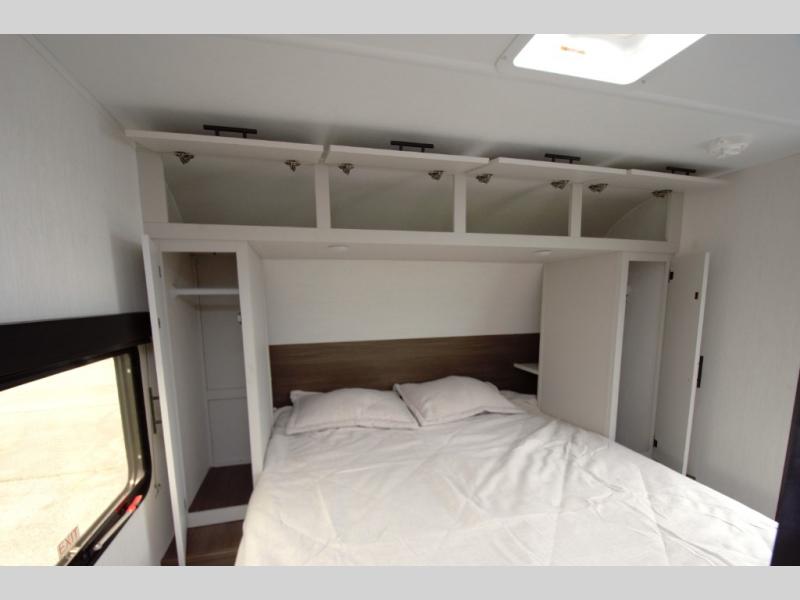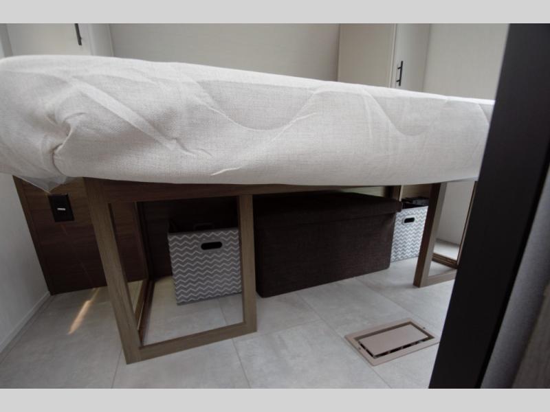 At the end of the day, retreat to your private front bedroom featuring a camp king bed with a built-in ottoman and storage underneath. Overhead cabinets and wardrobes keep your essentials organized, while the direct access to the walk-through bath adds convenience.