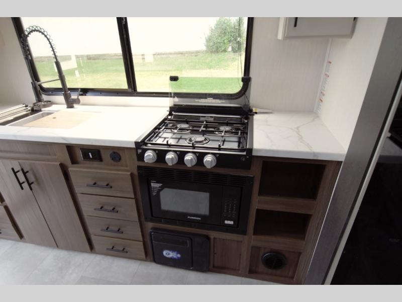 Outside, the Westbrook Luxury 245RKLC enhances every campsite. A 19-foot power awning with LED lighting creates an inviting patio space, while the exterior mini refrigerator keeps cold drinks close at hand. The drop-frame pass-through storage offers plenty of room for outdoor gear, and premium features like alloy wheels, a backup camera, and power stabilizer jacks make setup and towing simple.