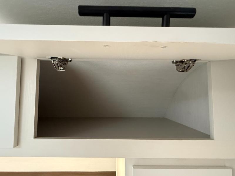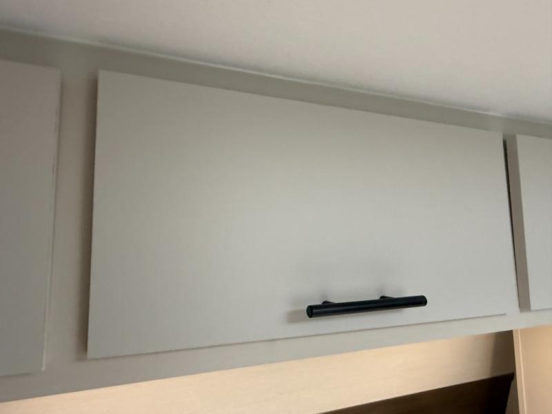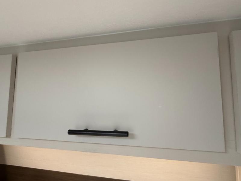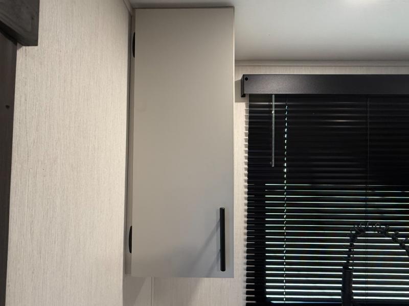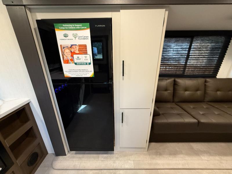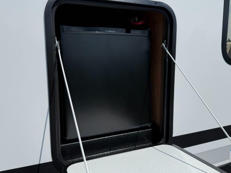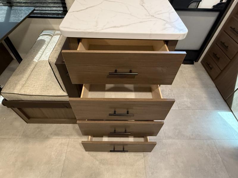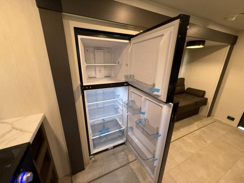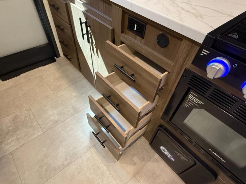 Appliances include: 3-burner cooktop (with high output front burner), air-fryer microwave oven, 10.6 cu ft 12-volt refrigerator.