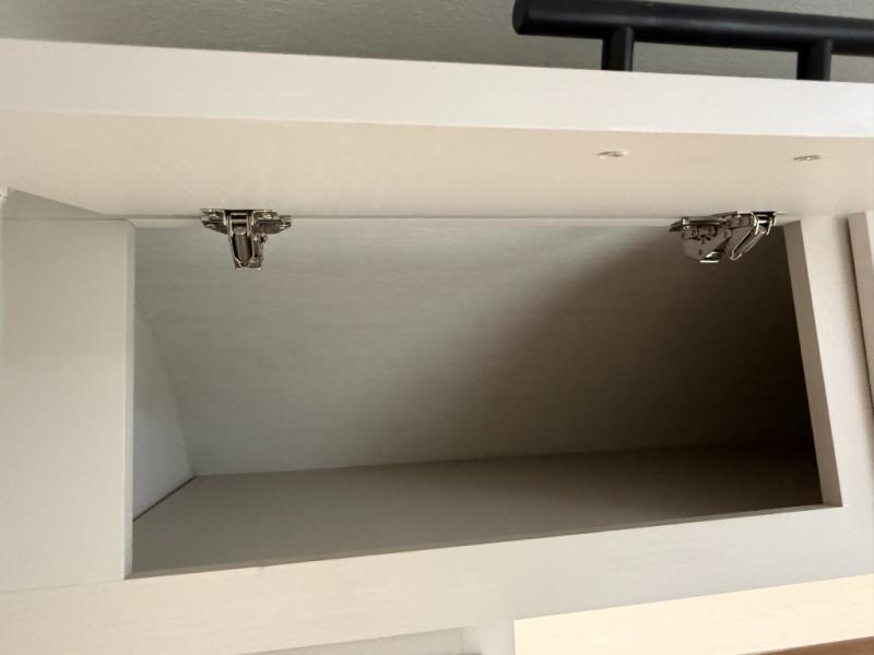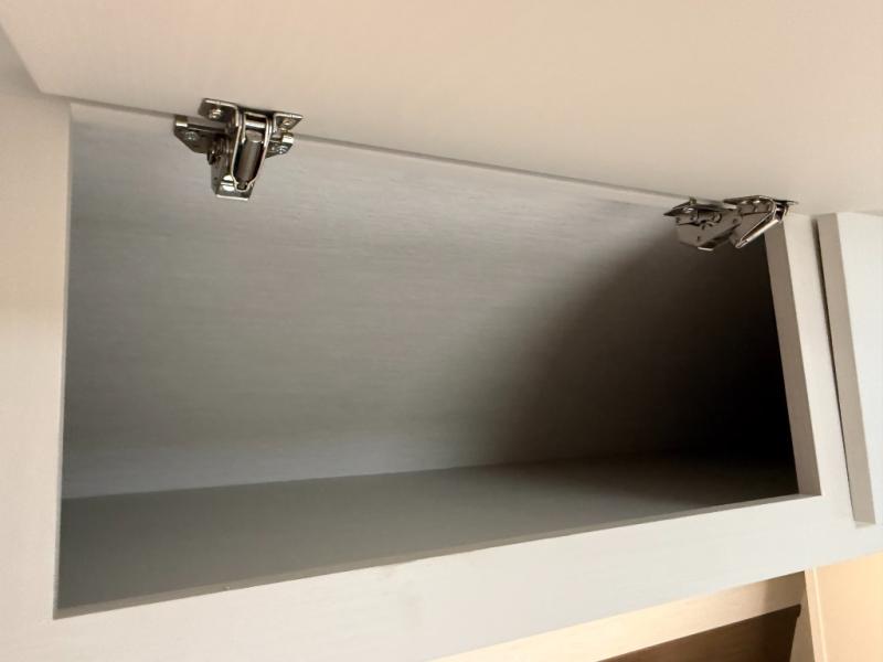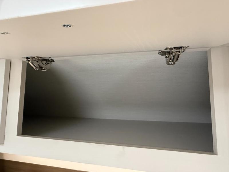 High-end finishes: two-tone custom cabinetry, residential-style drawer glides, and seamless vinyl (Carefree Congoleum) flooring.