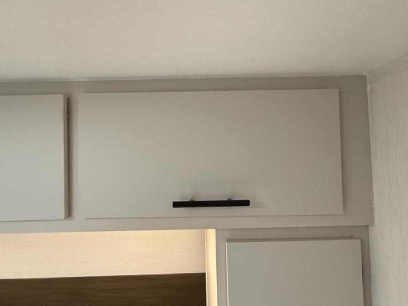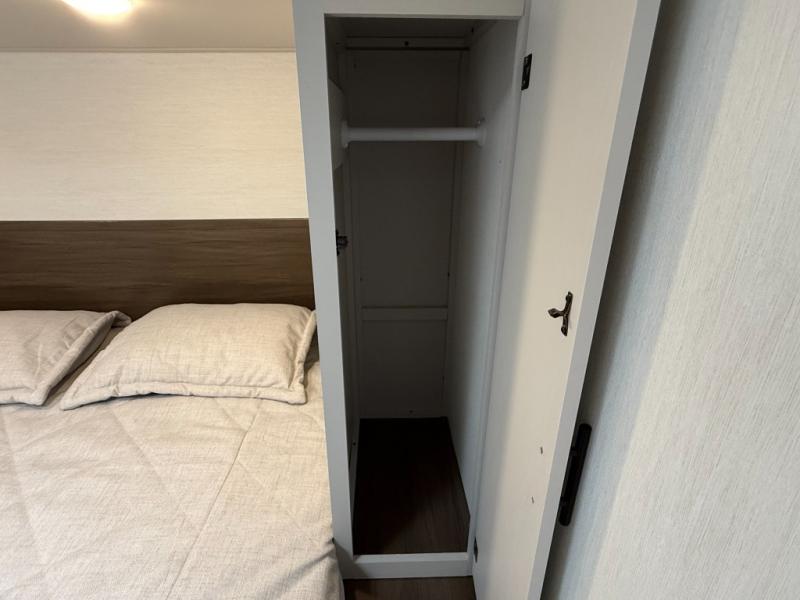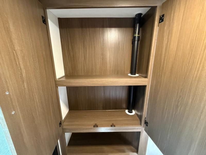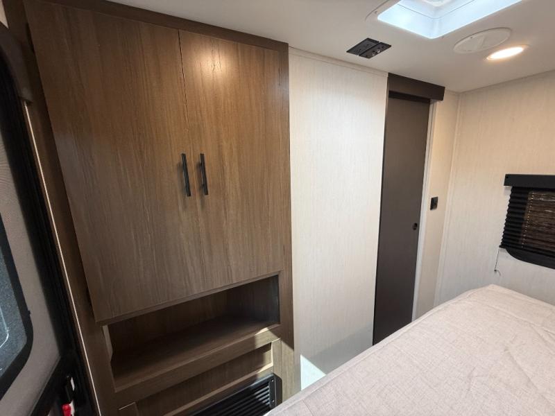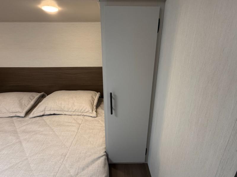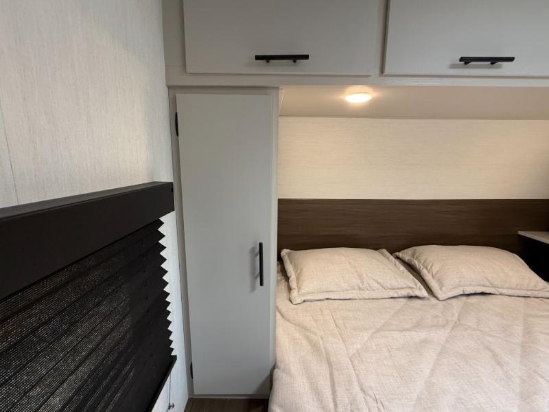Front master sleeping area with a “Campers-King” bed (i.e., extra large) in many listings; ample storage underneath (ottoman/storage bins) and dual shirt closets.