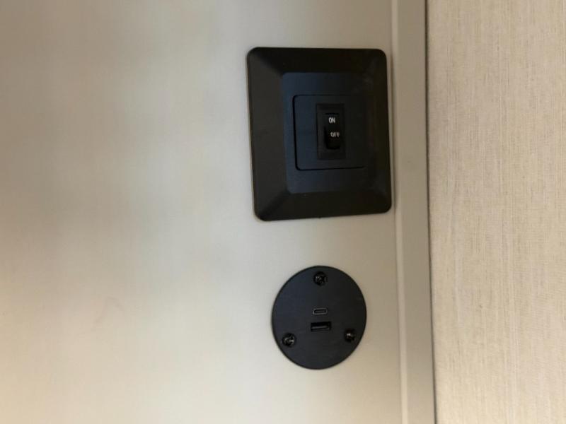 USB-C charging ports (especially at bunks in some models) and pet/owner-friendly details (e.g., dog-leash latch, pet dish/shoe storage).