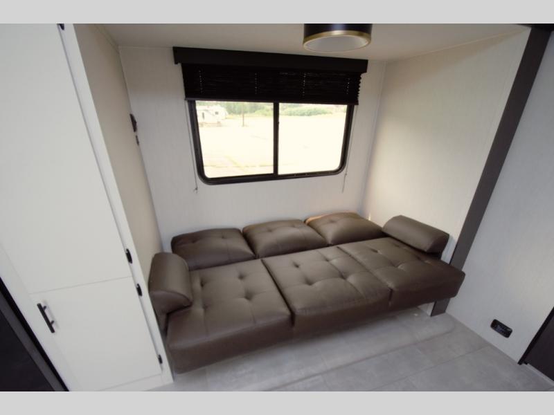 Step inside through either of the dual entry doors—one leading directly into the well-appointed rear kitchen, the other into your private front bedroom. The rear kitchen makes cooking a pleasure with premium appliances, ample counter space, and custom two-toned cabinetry. After dinner, relax on the sofa slide or gather at the booth dinette for card games, meals, or late-night conversations.