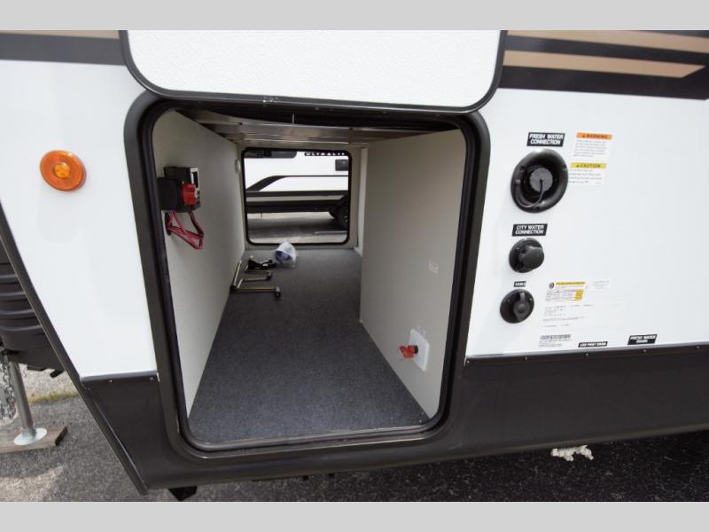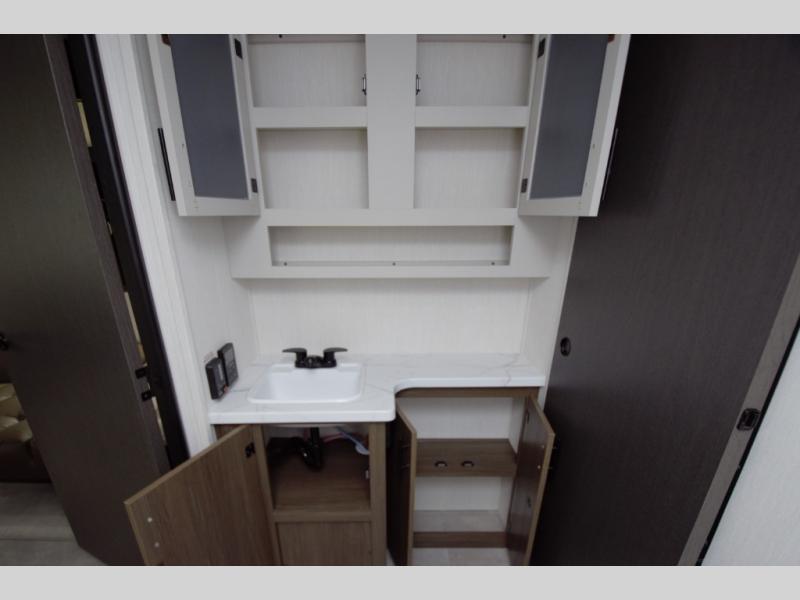 Outside, the Westbrook Luxury 245RKLC enhances every campsite. A 19-foot power awning with LED lighting creates an inviting patio space, while the exterior mini refrigerator keeps cold drinks close at hand. The drop-frame pass-through storage offers plenty of room for outdoor gear, and premium features like alloy wheels, a backup camera, and power stabilizer jacks make setup and towing simple.