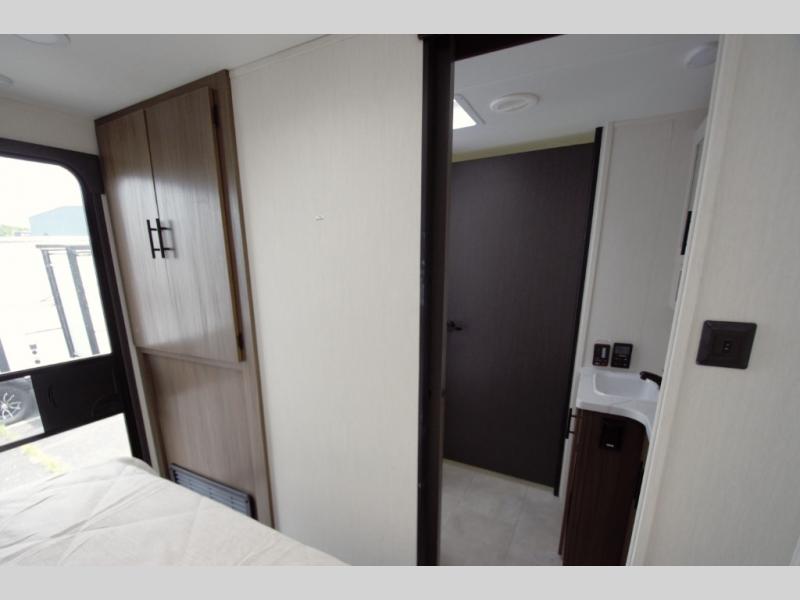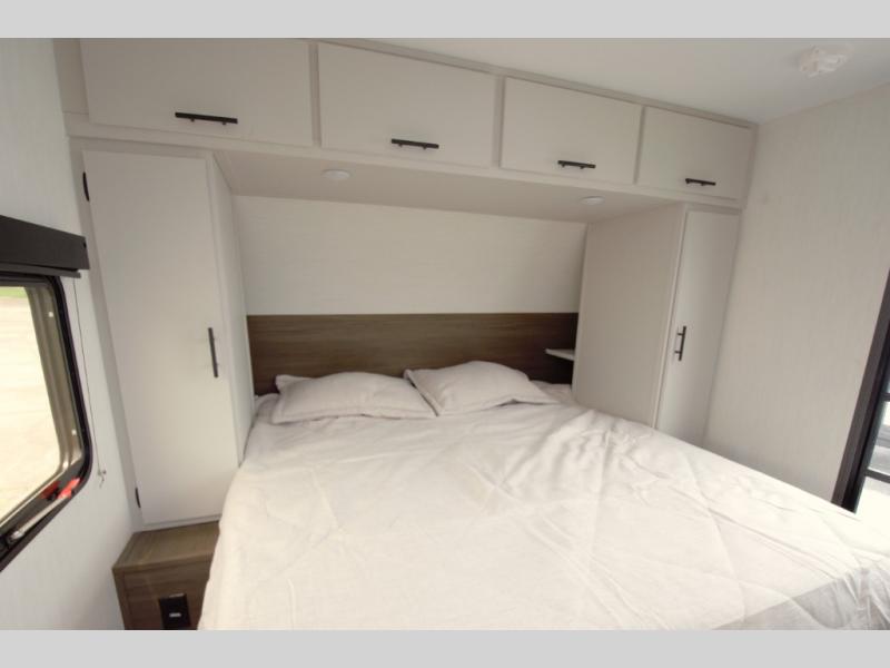 At the end of the day, retreat to your private front bedroom featuring a camp king bed with a built-in ottoman and storage underneath. Overhead cabinets and wardrobes keep your essentials organized, while the direct access to the walk-through bath adds convenience.