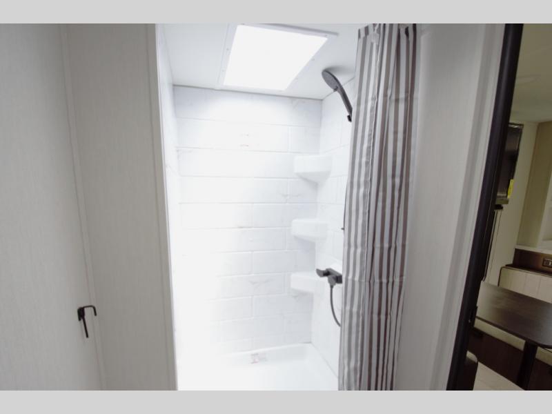 The spacious bathroom connects the living area and bedroom, making it easy for everyone to access. A residential-style shower surround with multiple ledges, along with an on-demand tankless water heater, ensures hot showers whenever you need them.
