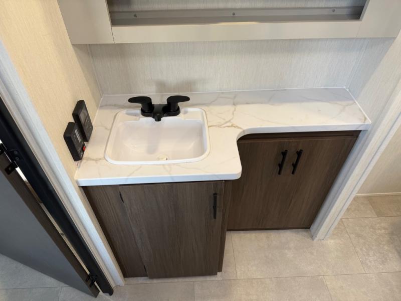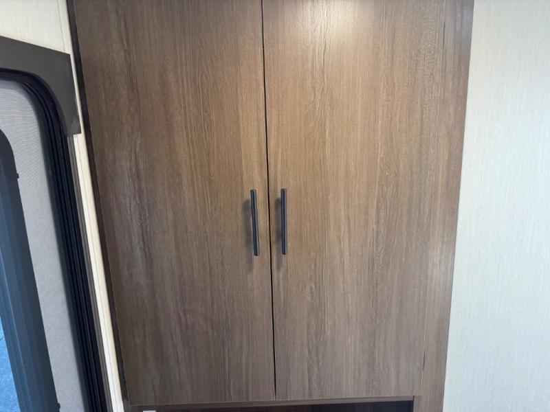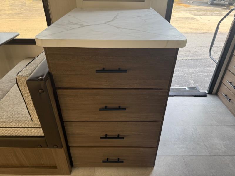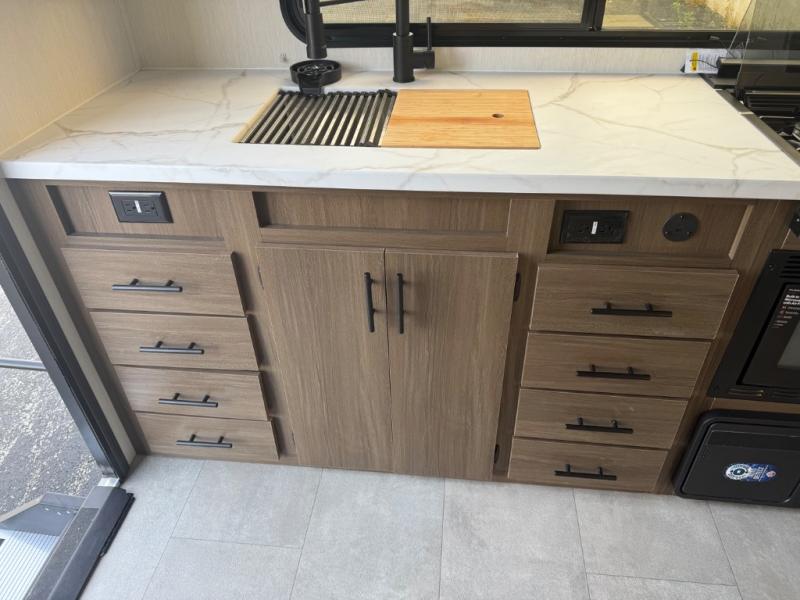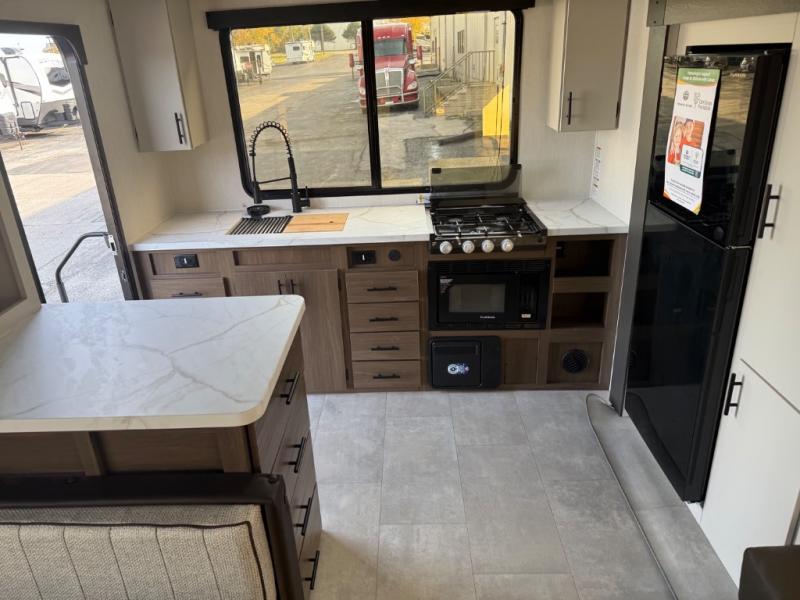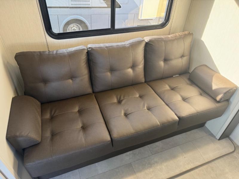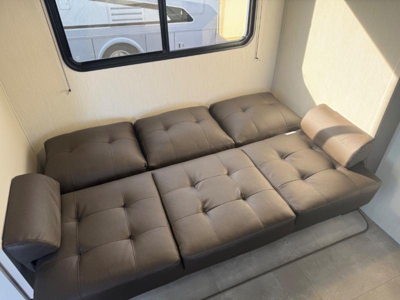 Every trip in this luxury travel trailer will be one to remember! Once you arrive at your destination, you can unload the pass-through storage, put out the 19' LED lit power awning, and grab a cold drink from the outside mini fridge. There are also dual entry doors which will allow you to enter in through the rear kitchen or the front master bedroom. A camp king bed with an ottoman underneath will provide a great night's rest, and the walk-thru bath is easily accessible for everyone to use. While the chef of your group makes dinner in the kitchen, your crew can relax on the sofa slide out or play a game at the booth dinette!