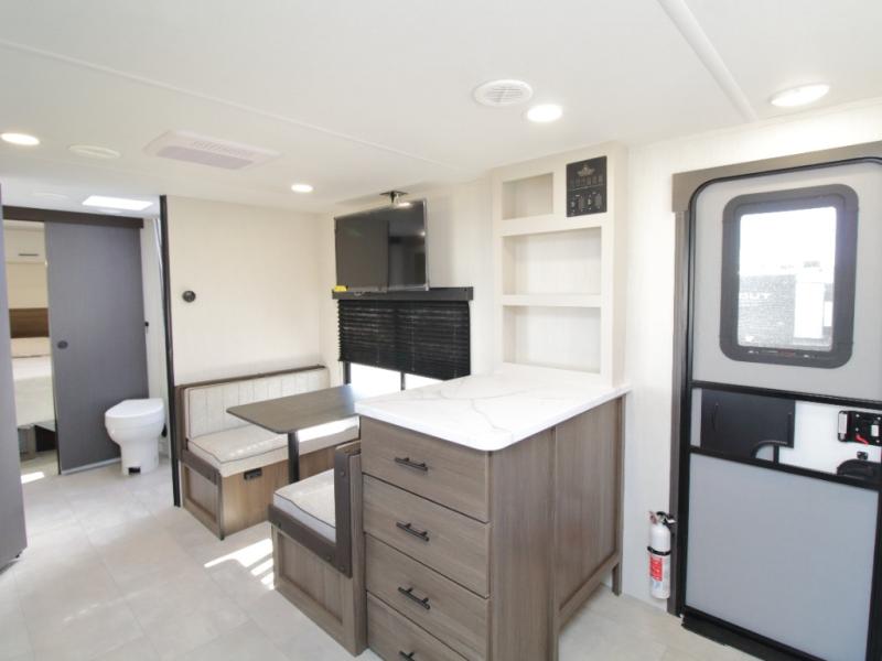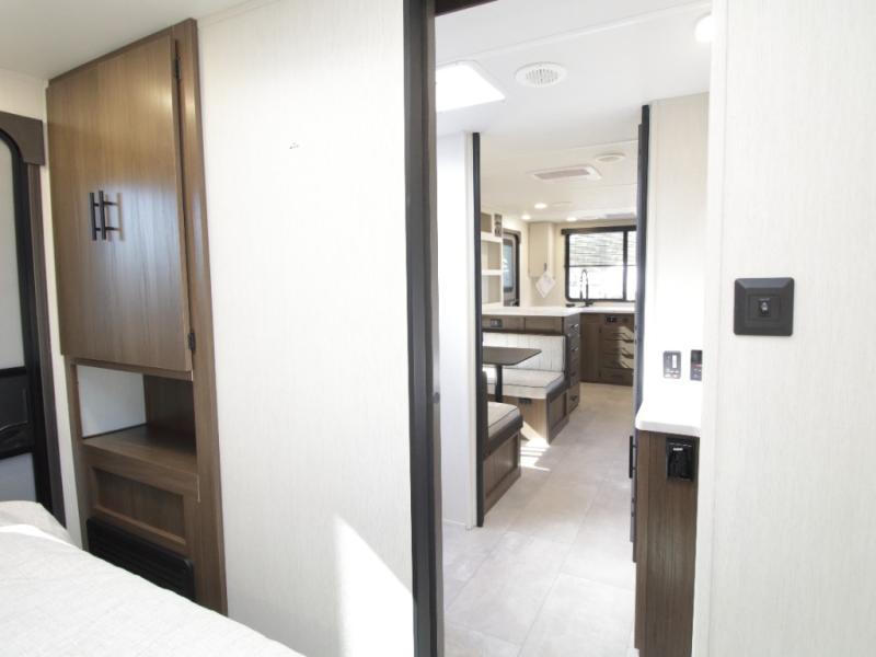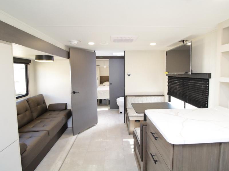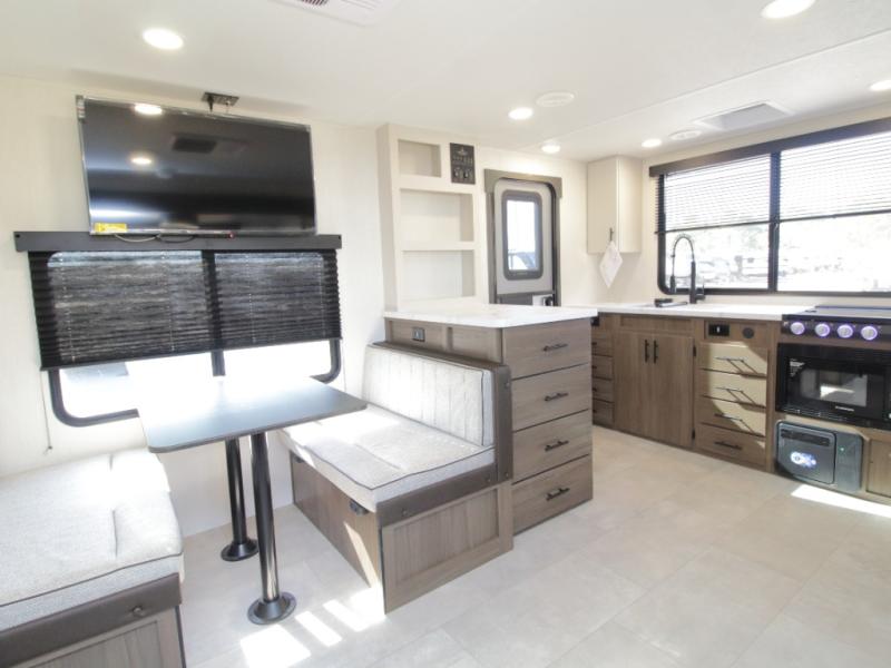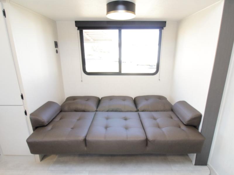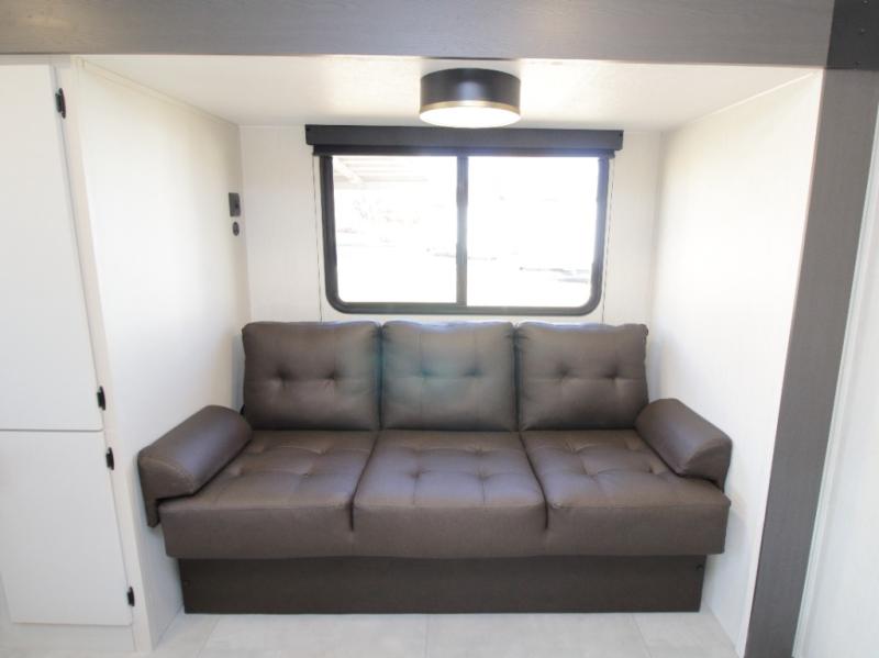 The camp king bed with an ottoman offers a comfortable retreat at the end of the day, and the walk-through bath provides easy access for everyone. In the main living area, the sofa slide and booth dinette create space to unwind, dine, or play games together.