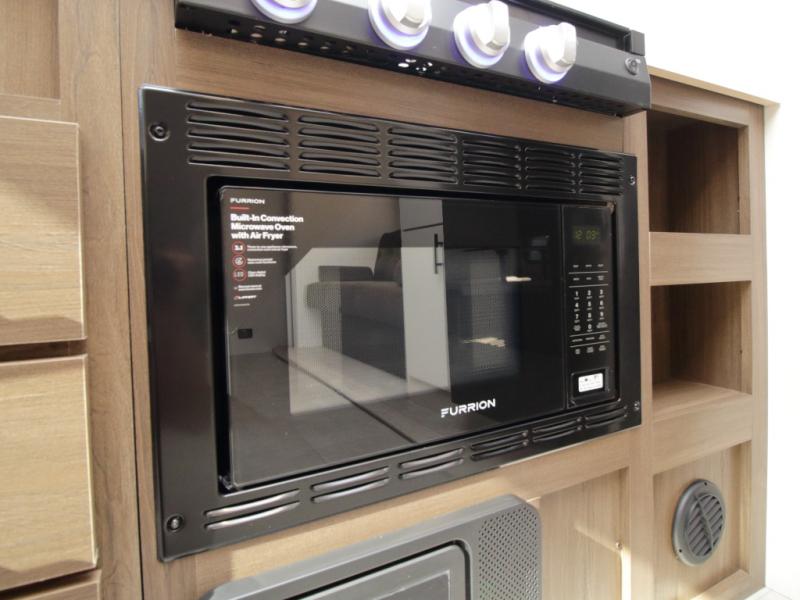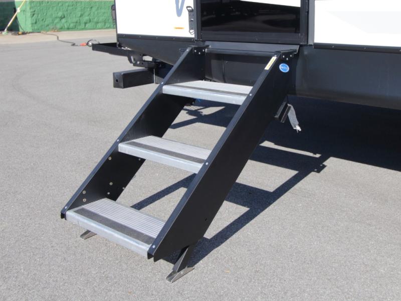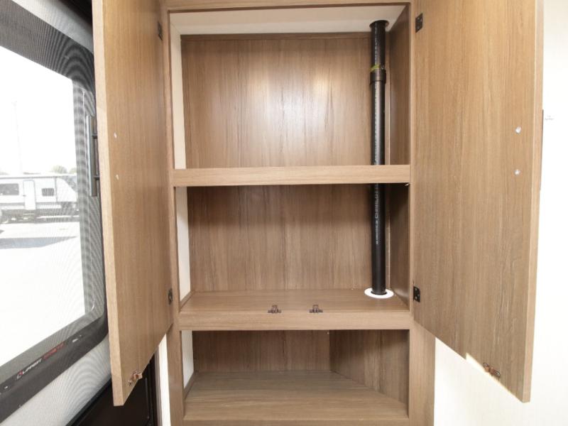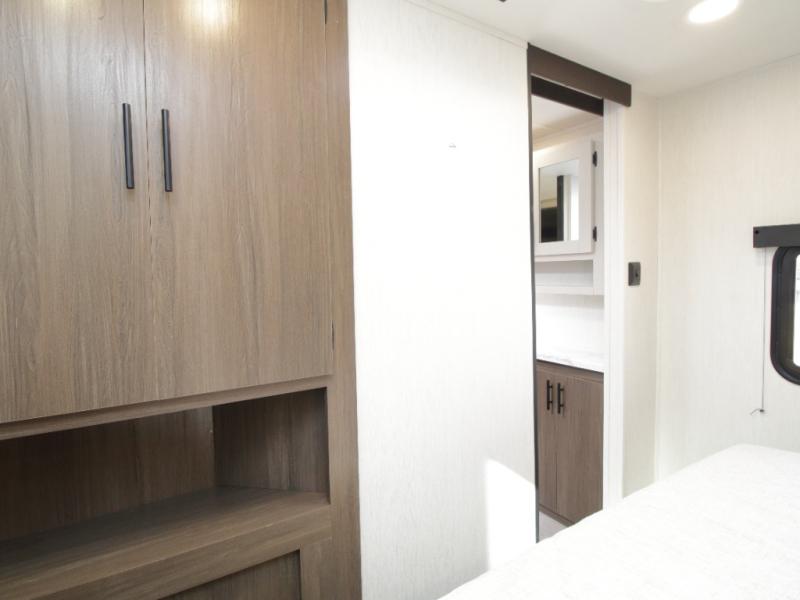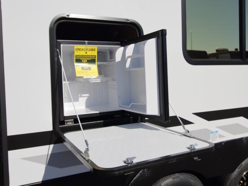 Set up camp with ease thanks to the drop-frame pass-through storage, LED-lit 19' power awning, and the convenient outside mini fridge for quick refreshments. Dual entry doors allow smooth access into either the rear kitchen or the front bedroom, keeping foot traffic flowing.