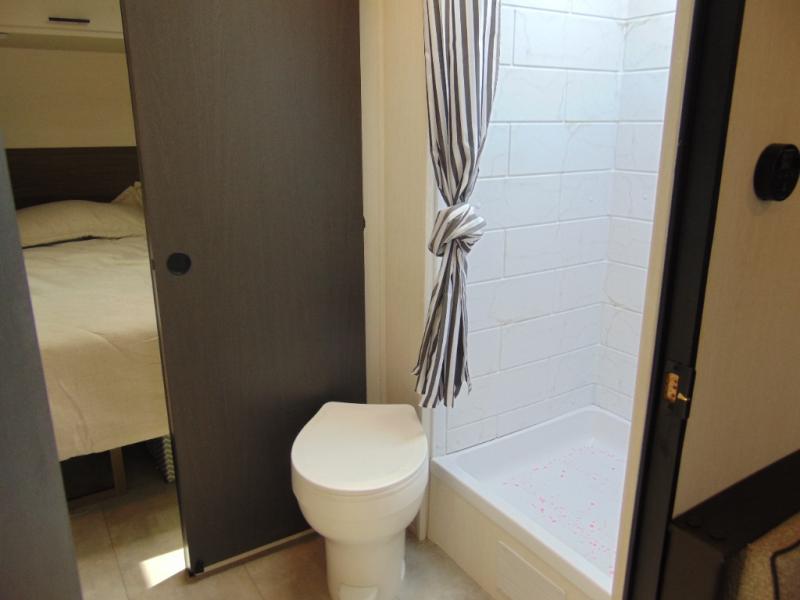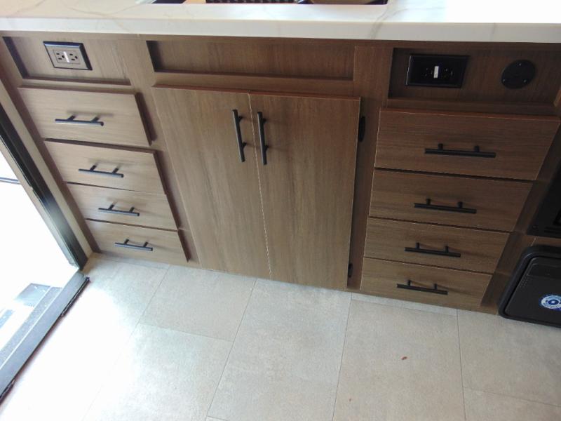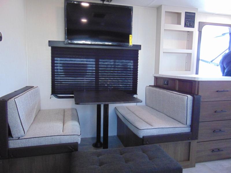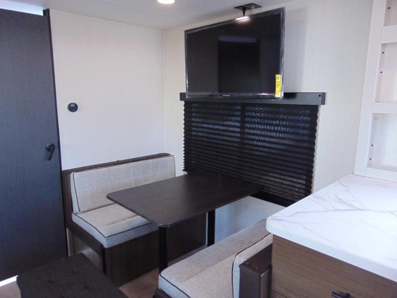 Every trip in this luxury travel trailer will be one to remember! Once you arrive at your destination, you can unload the pass-through storage, put out the 19' LED lit power awning, and grab a cold drink from the outside mini fridge. There are also dual entry doors which will allow you to enter in through the rear kitchen or the front master bedroom. A camp king bed with an ottoman underneath will provide a great night's rest, and the walk-thru bath is easily accessible for everyone to use. While the chef of your group makes dinner in the kitchen, your crew can relax on the sofa slide out or play a game at the booth dinette!
