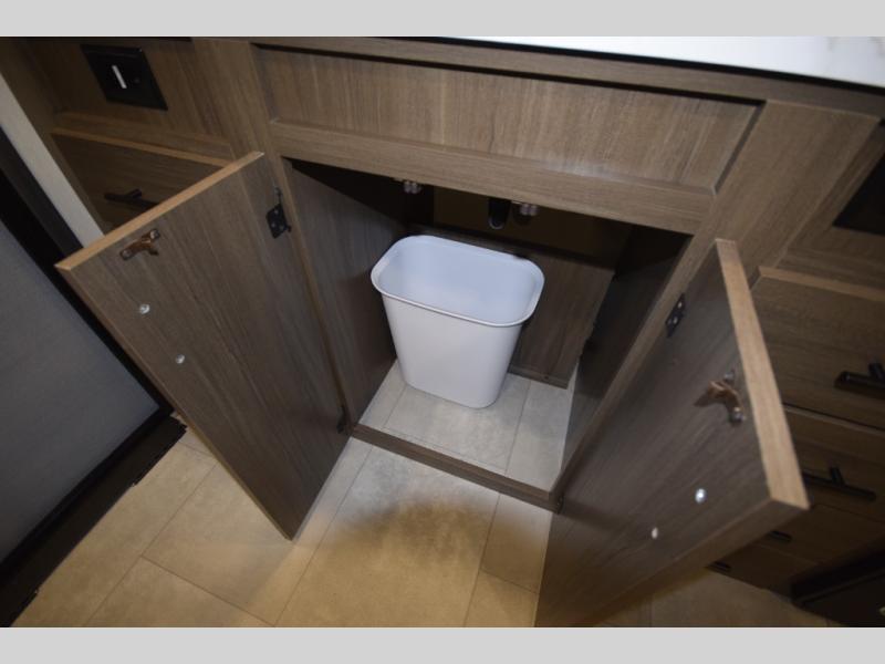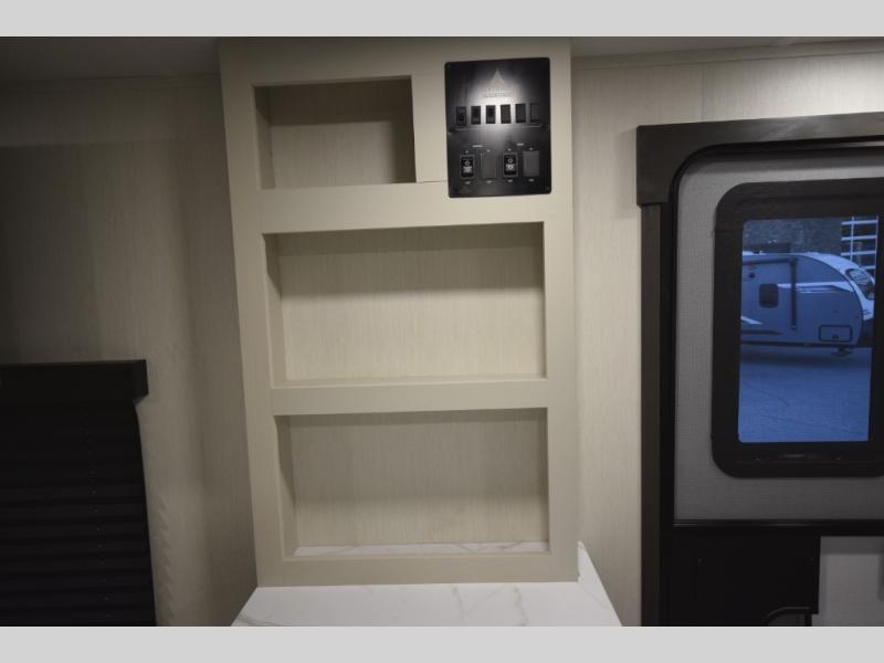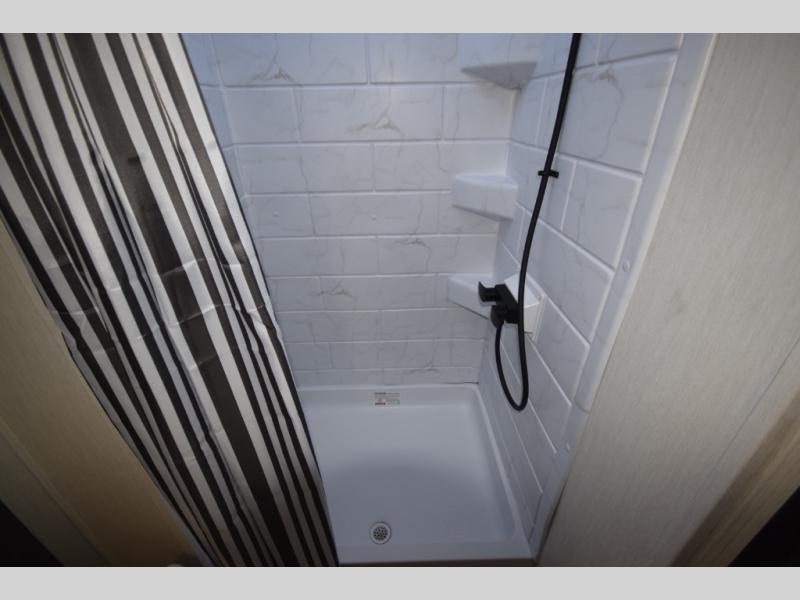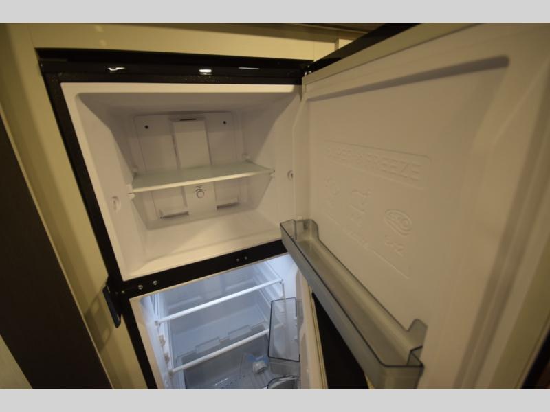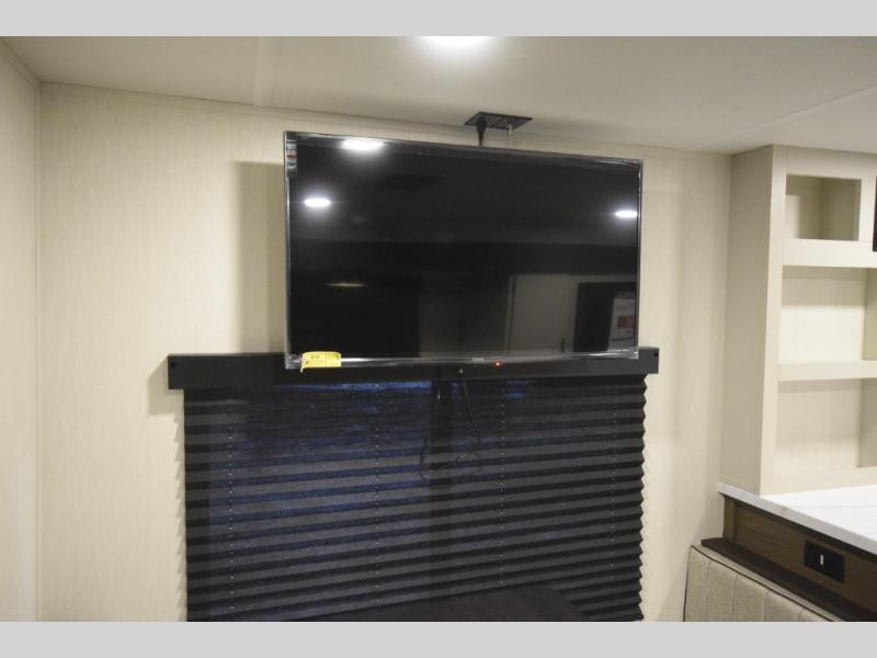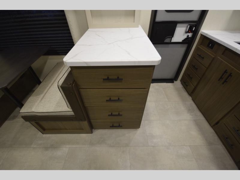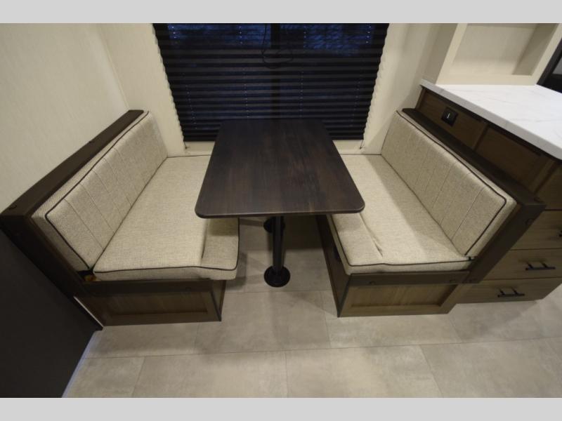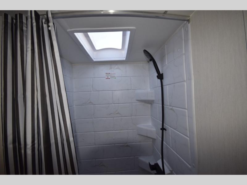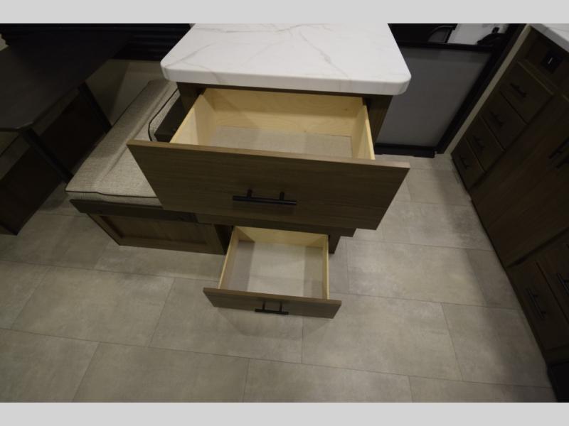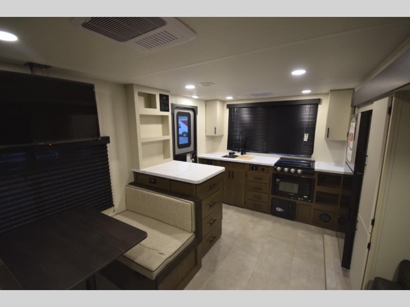 Inside, you’ll discover upscale touches such as seamless Carefree Congoleum flooring, residential extended ball-bearing drawer glides, two-toned custom cabinetry, and a shower surround with multiple ledges for convenience. Enjoy consistent comfort with the 15,000 BTU ducted A/C and auto-ignition furnace, while the on-demand tankless water heater keeps hot water ready whenever adventure calls.