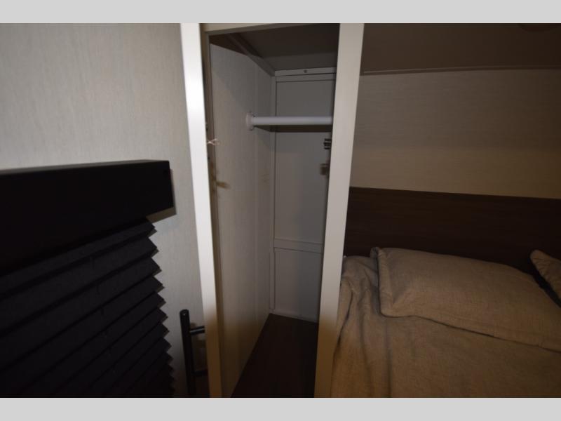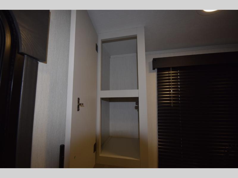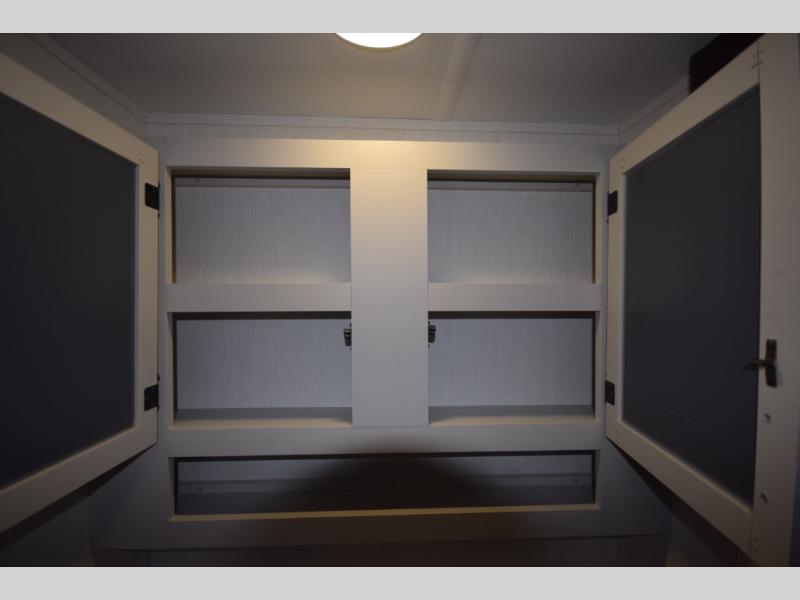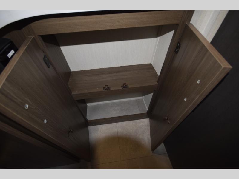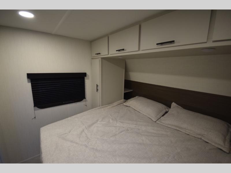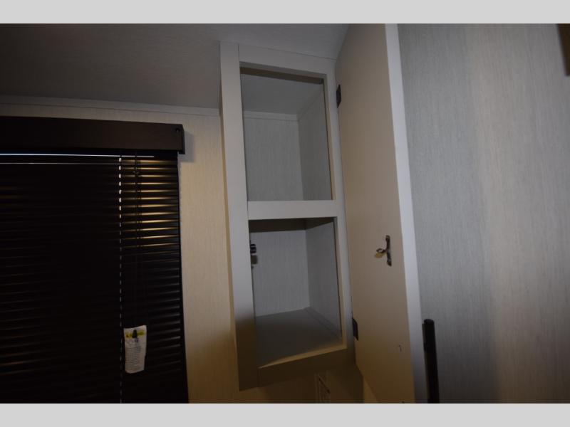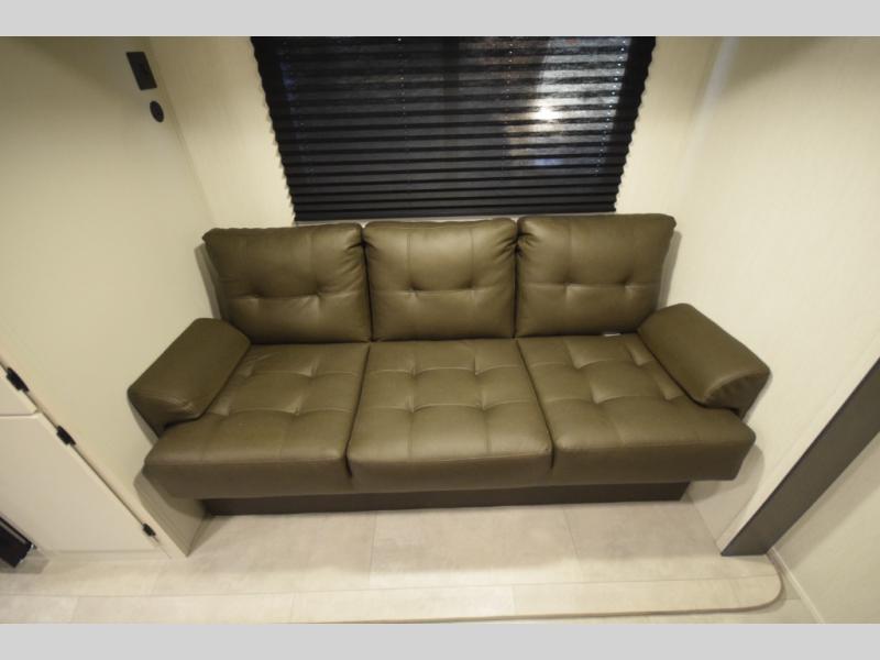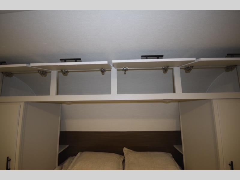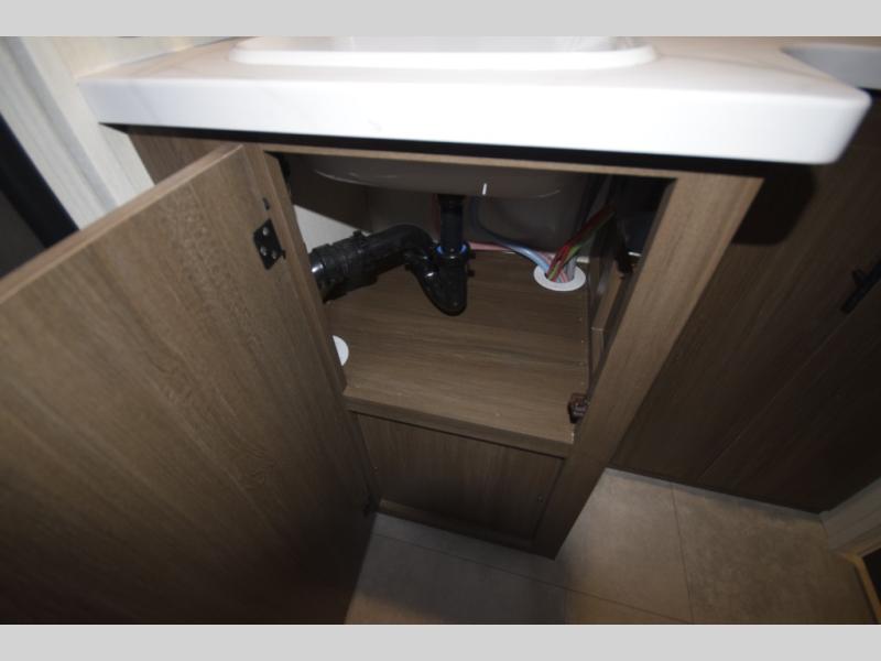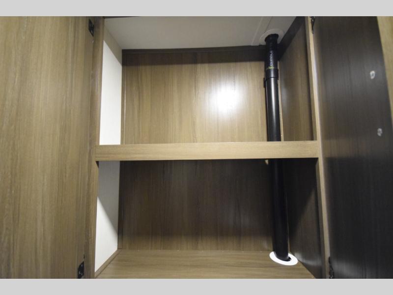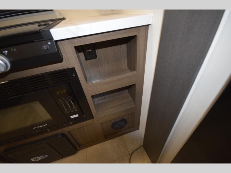 Inside, you’ll discover upscale touches such as seamless Carefree Congoleum flooring, residential extended ball-bearing drawer glides, two-toned custom cabinetry, and a shower surround with multiple ledges for convenience. Enjoy consistent comfort with the 15,000 BTU ducted A/C and auto-ignition furnace, while the on-demand tankless water heater keeps hot water ready whenever adventure calls.