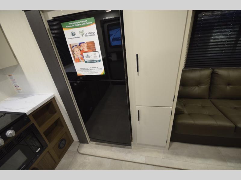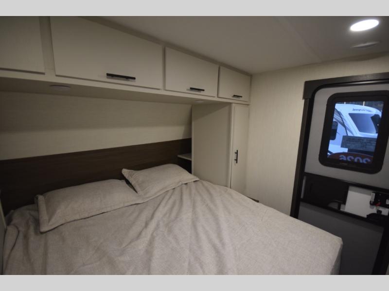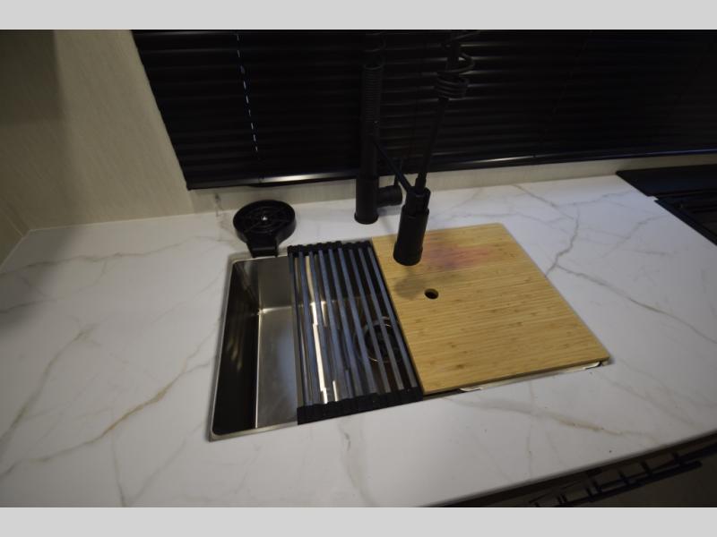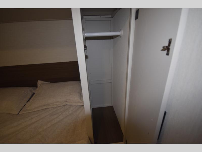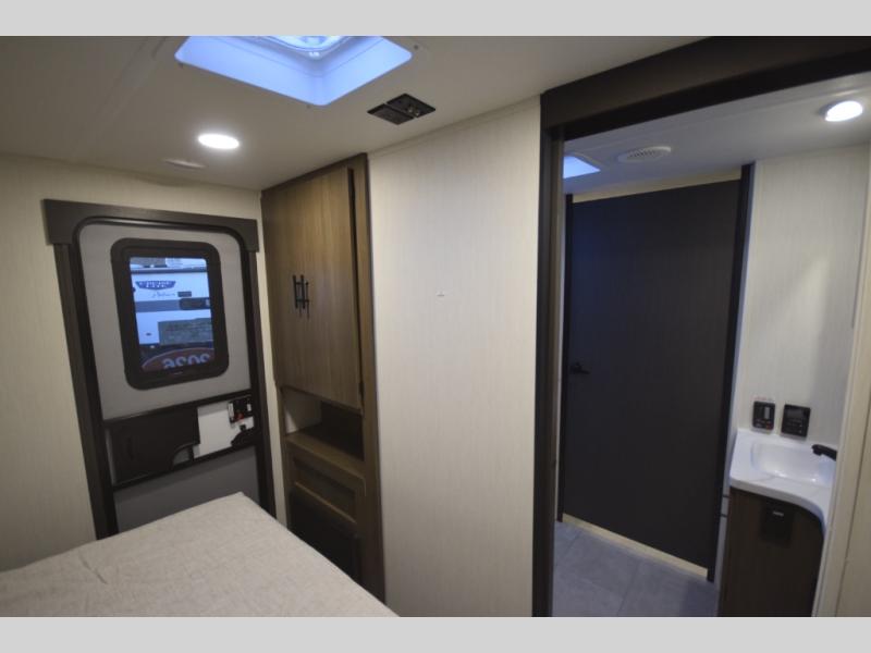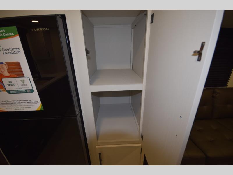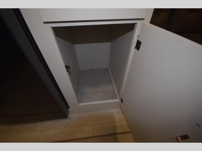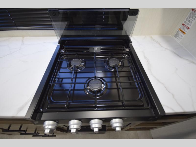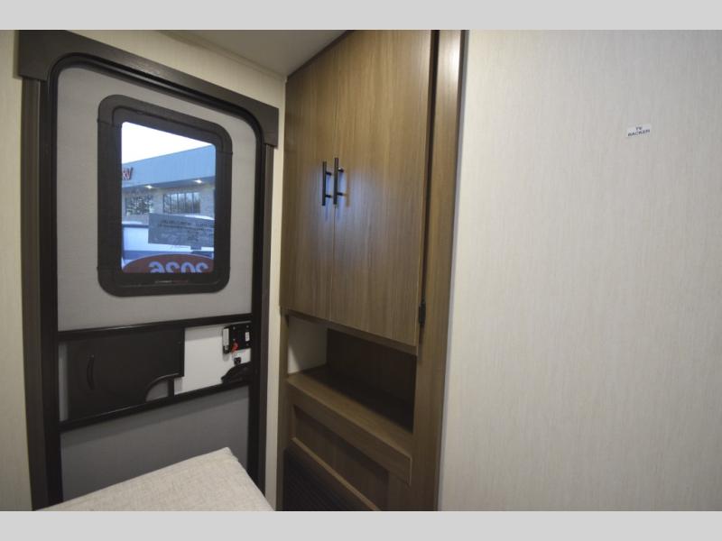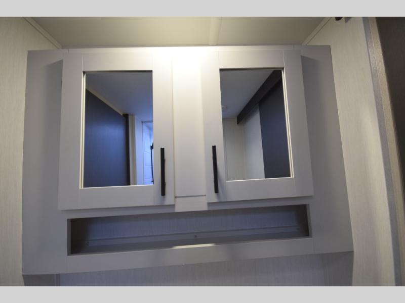 Inside, you’ll discover upscale touches such as seamless Carefree Congoleum flooring, residential extended ball-bearing drawer glides, two-toned custom cabinetry, and a shower surround with multiple ledges for convenience. Enjoy consistent comfort with the 15,000 BTU ducted A/C and auto-ignition furnace, while the on-demand tankless water heater keeps hot water ready whenever adventure calls.