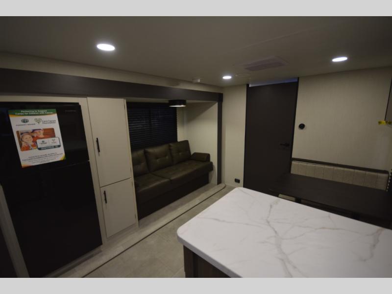 Dual entry doors offer convenient access, letting you step directly into the fully equipped rear kitchen or enter the serene front master bedroom. The kitchen provides everything you need to fuel your adventures, while the sofa slide out and booth dinette create a welcoming space for game nights, storytelling, or relaxing after a day on the trails. When it’s time to turn in, the front master bedroom features a roomy camp king bed with a built-in ottoman for added storage and comfort. The walk-thru bath ensures quick and easy access for everyone, making your travels as smooth as they are enjoyable.