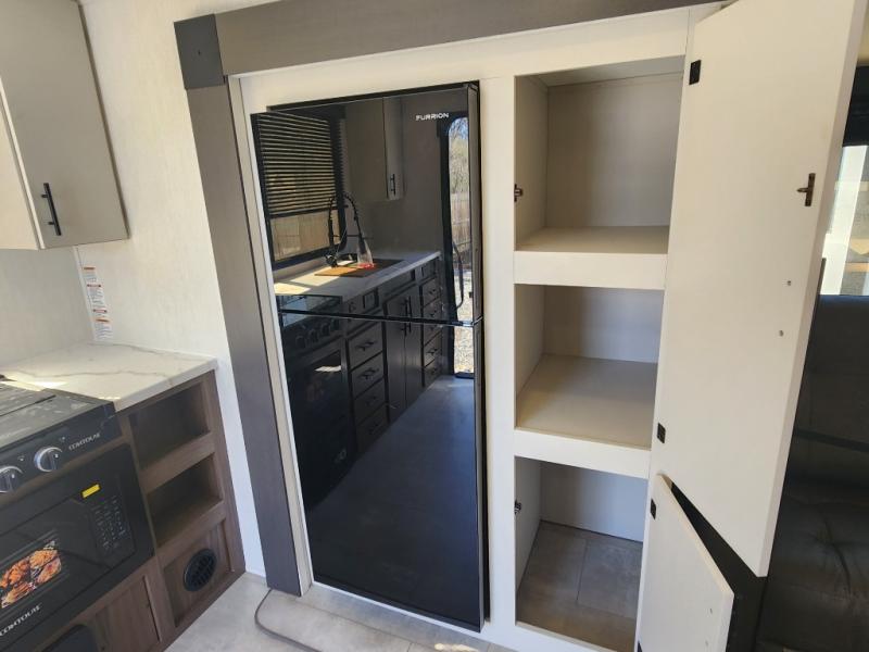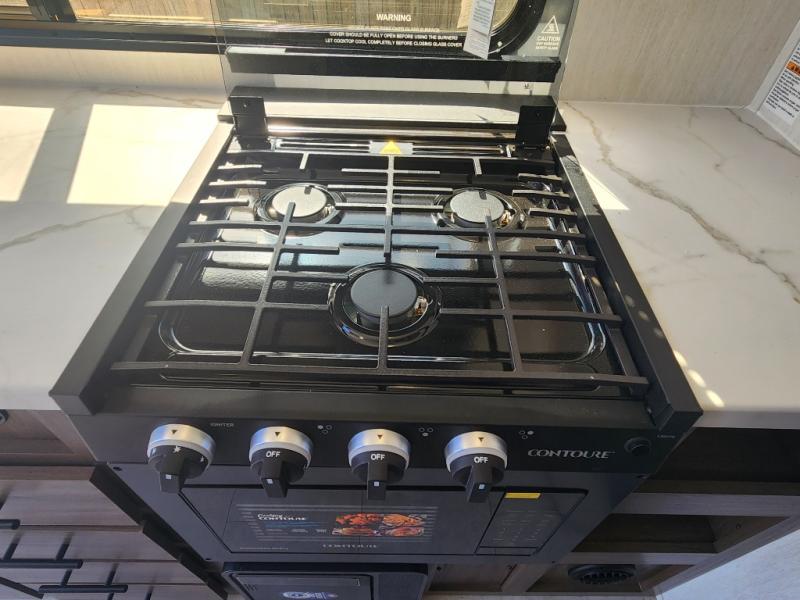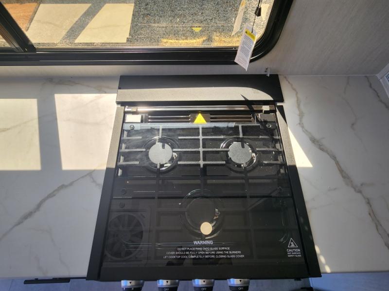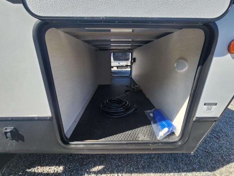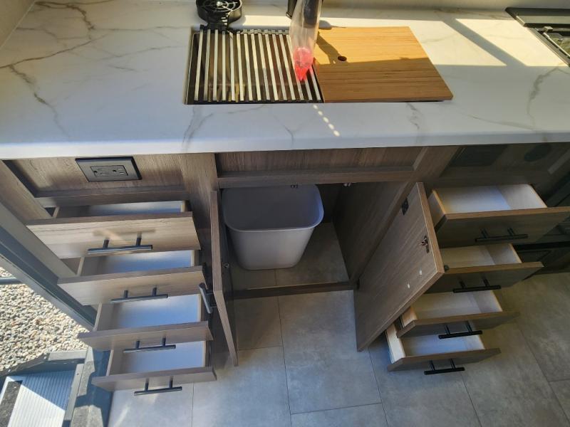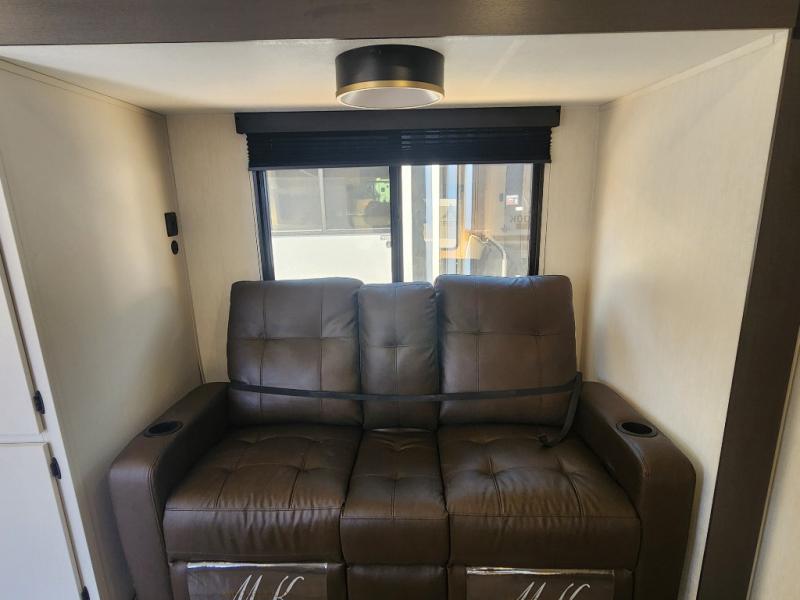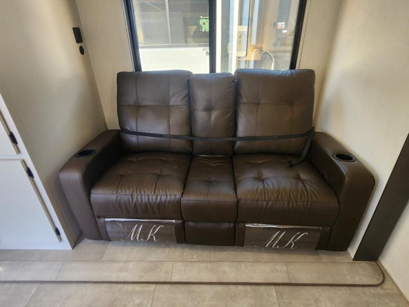 Every trip in this luxury travel trailer will be one to remember! Once you arrive at your destination, you can unload the pass-through storage, put out the 19' LED lit power awning, and grab a cold drink from the outside mini fridge. There are also dual entry doors which will allow you to enter in through the rear kitchen or the front master bedroom. A camp king bed with an ottoman underneath will provide a great night's rest, and the walk-thru bath is easily accessible for everyone to use. While the chef of your group makes dinner in the kitchen, your crew can relax on the sofa slide out or play a game at the booth dinette!