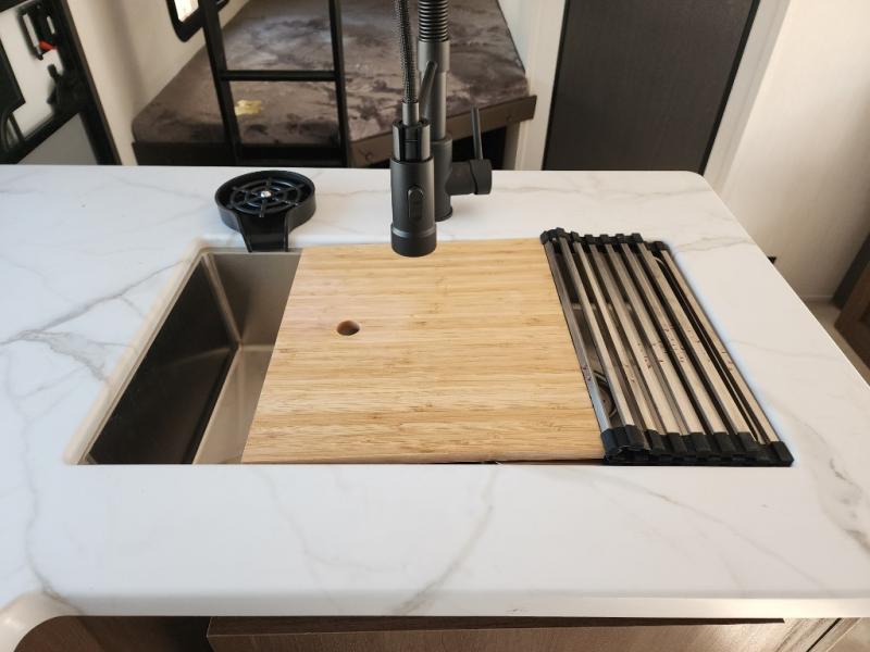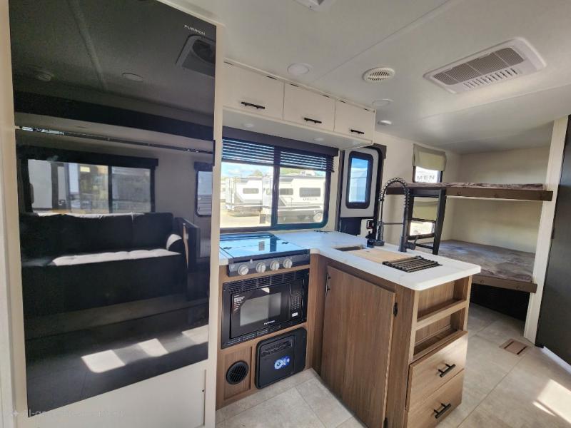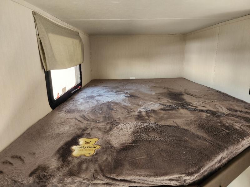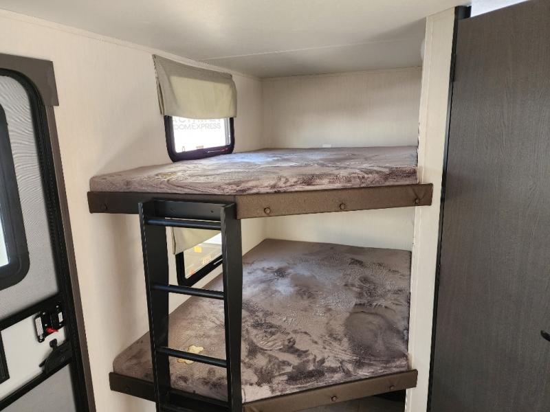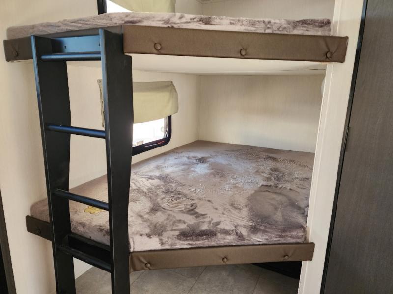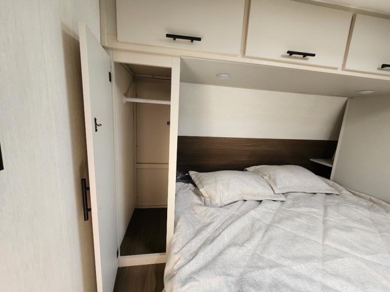 Every trip in this luxury travel trailer will be one to remember! Once you arrive at your destination, you can unload the pass-through storage, put out the 19' LED lit power awning, and grab a cold drink from the outside mini fridge. There are also dual entry doors which will allow you to enter in through the main living area or the front bedroom. A camp king bed with an ottoman underneath will provide a great night's rest, and there are dual bedside wardrobes to keep your things tidy. While the chef of your group makes dinner in the kitchen, your crew can relax on the sofa or play a game at the booth dinette within the large slide out! This unit also features an entertainment center with a pantry and shelves behind it, plus there is a closet in the bedroom with washer and dryer prep for added convenience!
