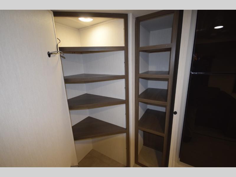 Enjoy organized living with shelves and pantry space neatly tucked behind the entertainment center for added functionality.