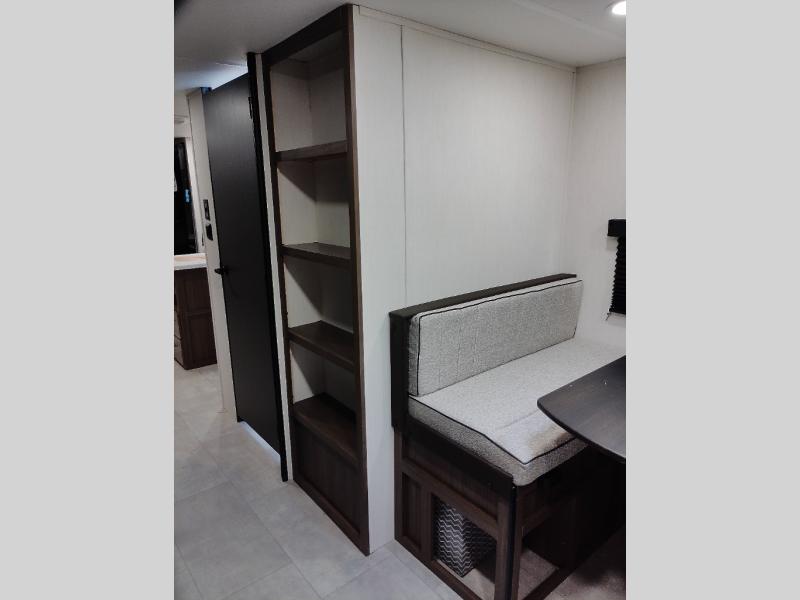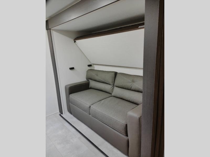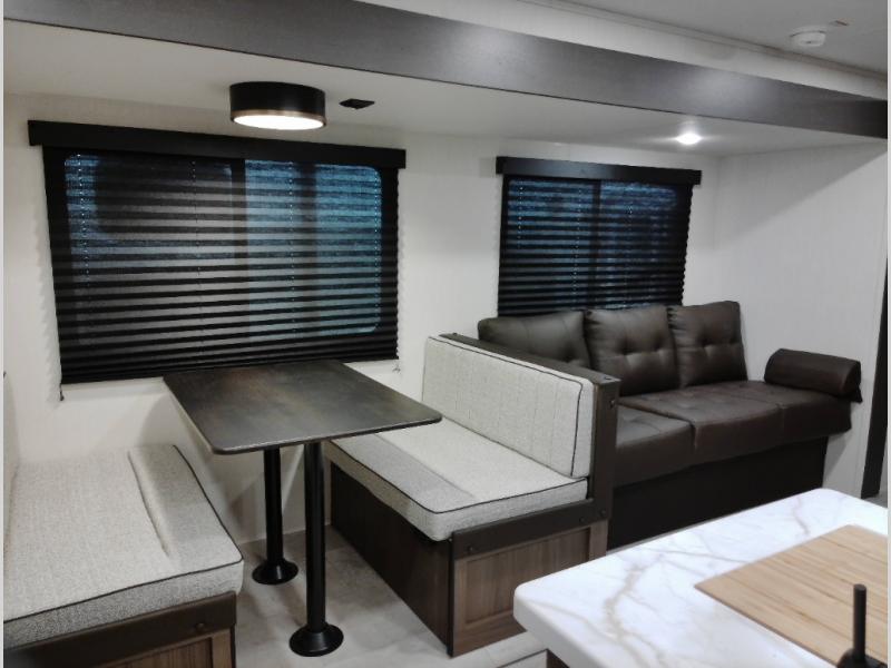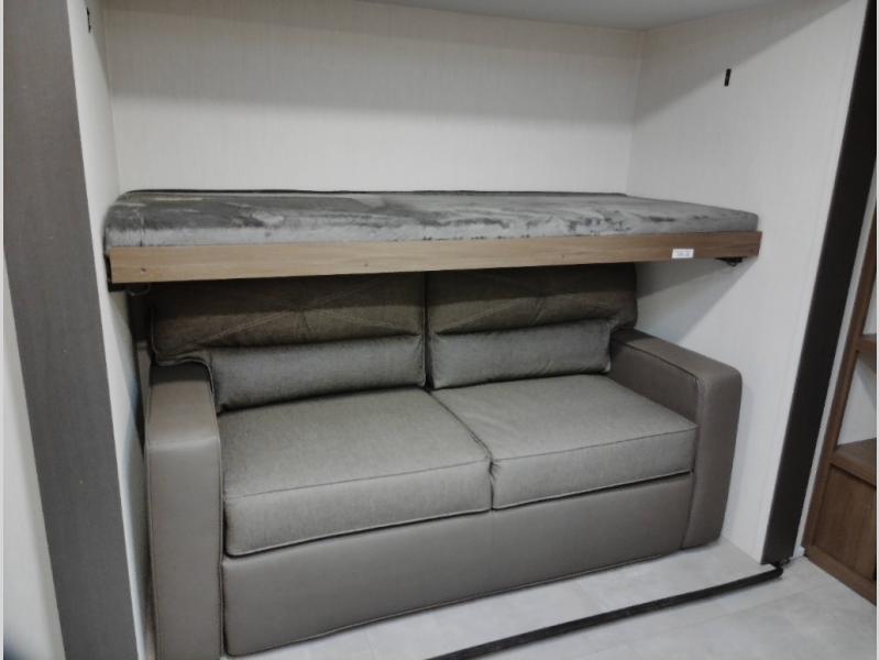 - Spacious Rear Bunkhouse includes a sofa bed and booth dinette, perfect for kids or guests