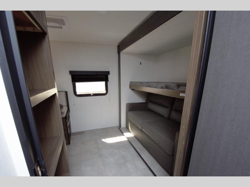 Spacious Rear Bunkhouse includes a sofa bed and booth dinette, perfect for kids or guests