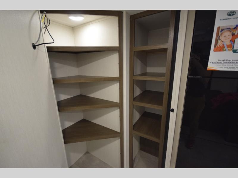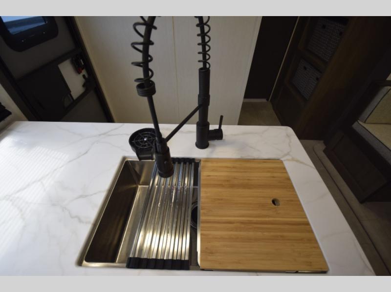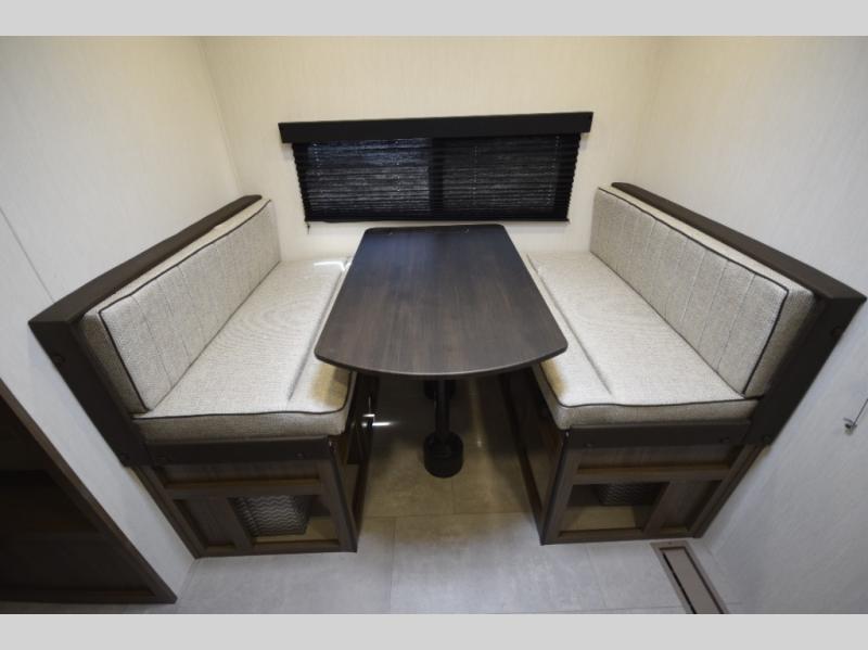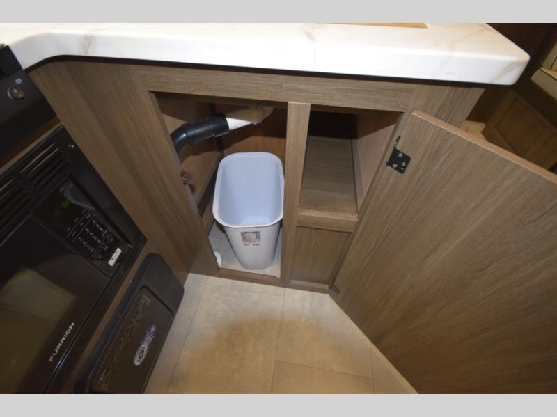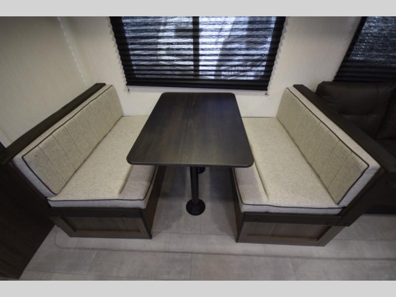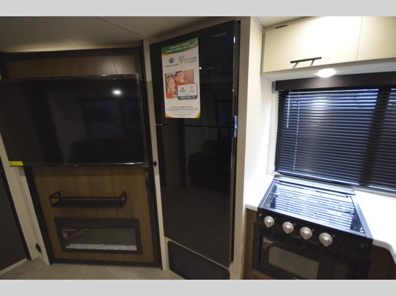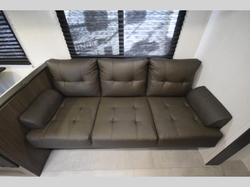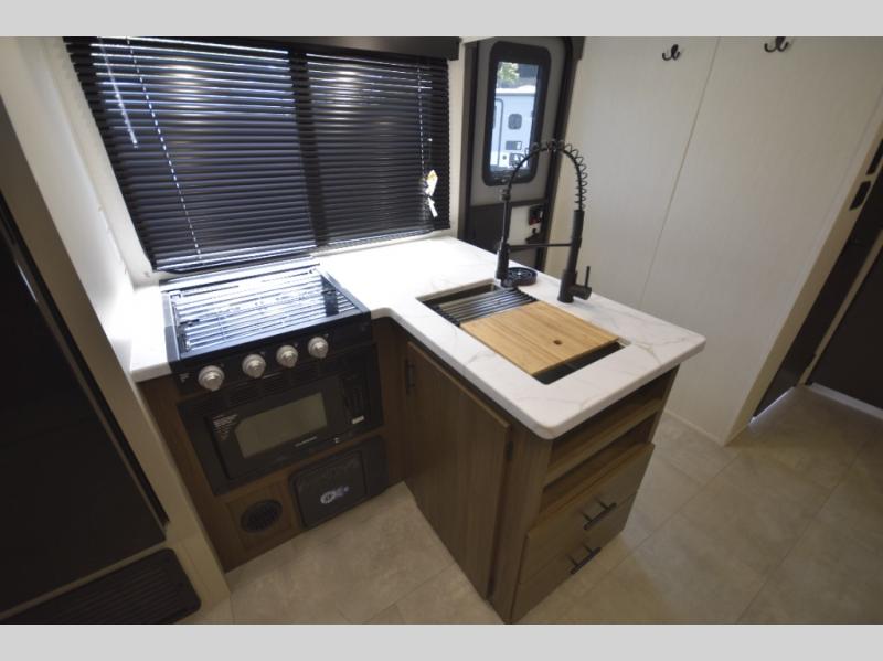 When it’s time to unwind indoors, the main living area offers a spacious slide-out with a sofa and dinette, perfect for meals, game nights, or relaxing after a day of adventure. The well-equipped kitchen is ready for your inner chef, and the entertainment center with hidden pantry and shelving keeps things both fun and functional.
