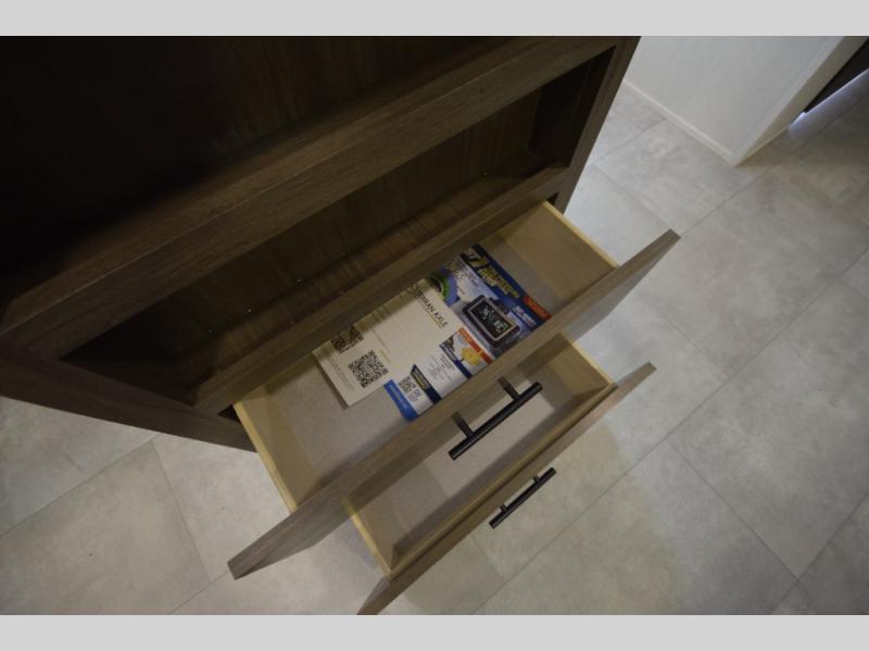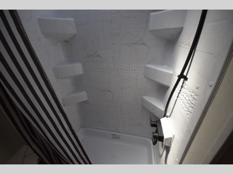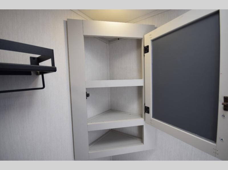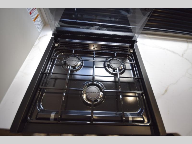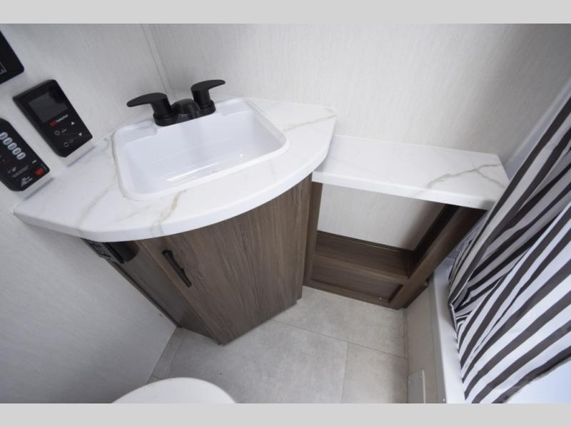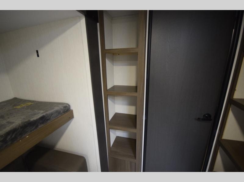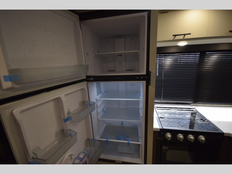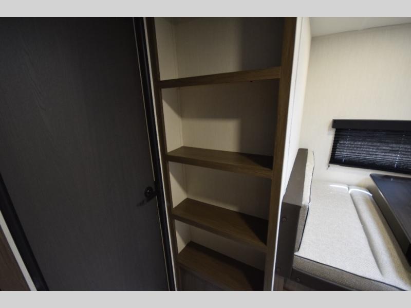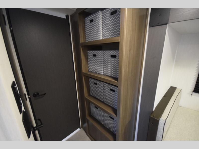 When it’s time to unwind indoors, the main living area offers a spacious slide-out with a sofa and dinette, perfect for meals, game nights, or relaxing after a day of adventure. The well-equipped kitchen is ready for your inner chef, and the entertainment center with hidden pantry and shelving keeps things both fun and functional.