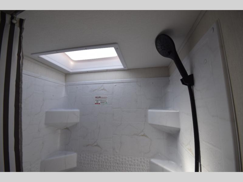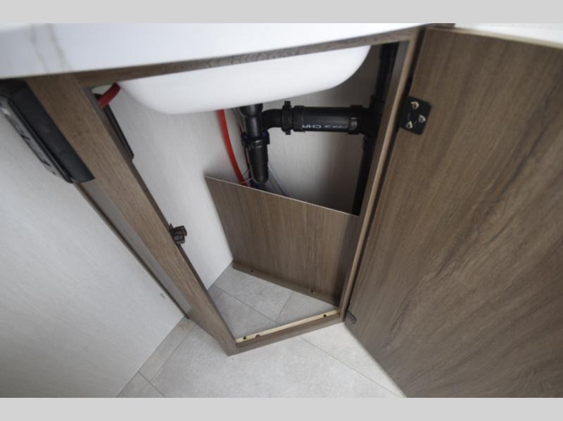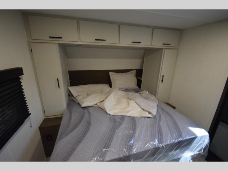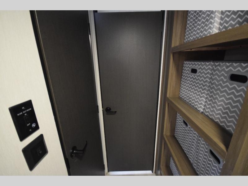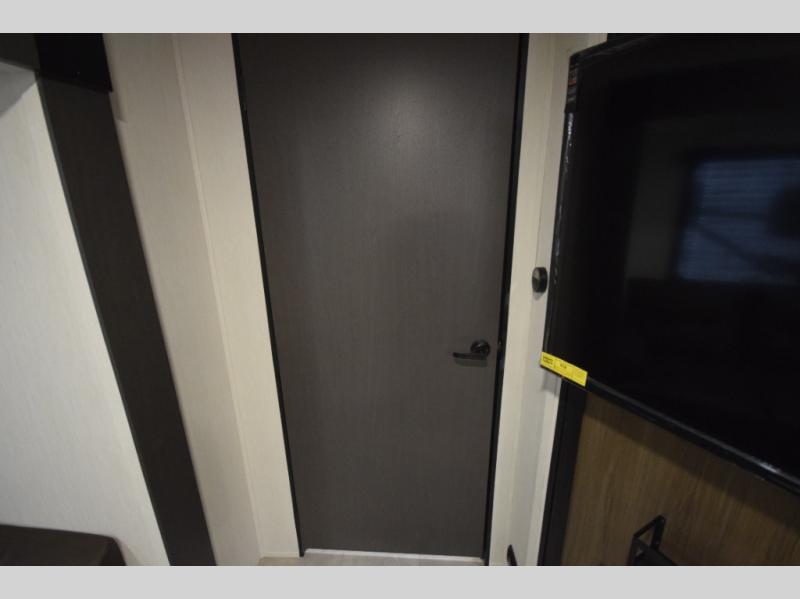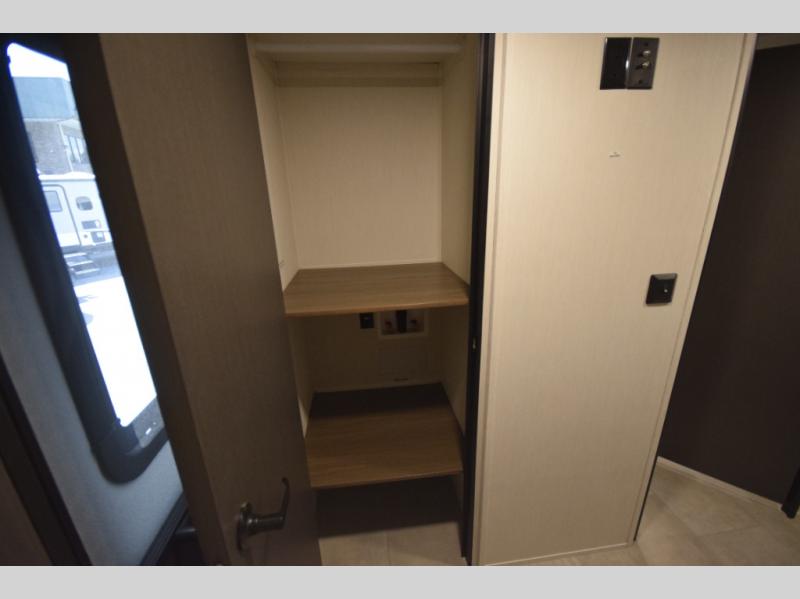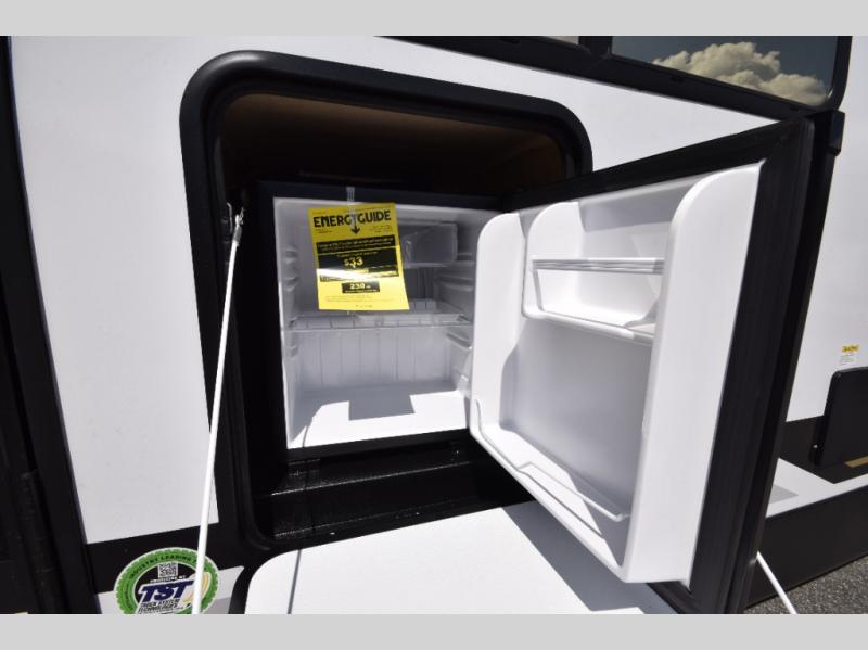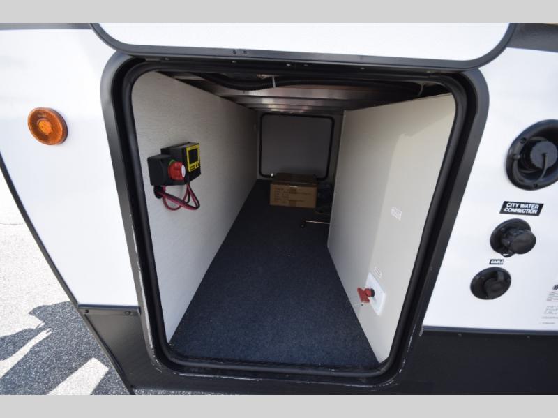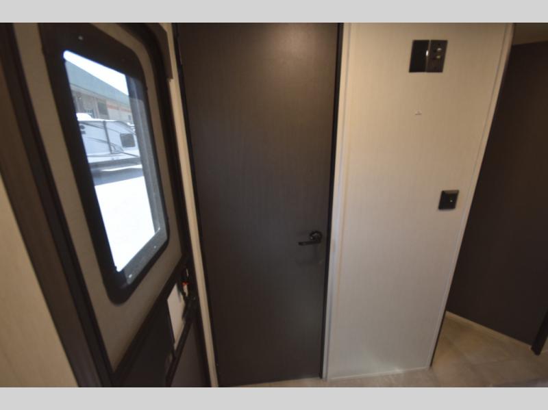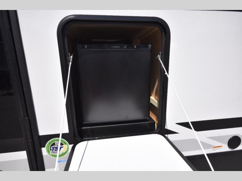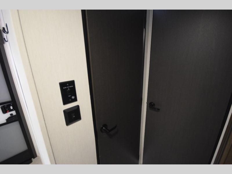 Step outside and take in the fresh air under the 19' LED-lit power awning, perfect for kicking back with a cold drink from the outdoor mini fridge. Need quick access? Use one of the dual entry doors—one leads straight to the main living space, the other directly to the serene front private bedroom with a Camp King bed and handy under-bed ottoman storage.