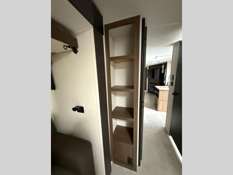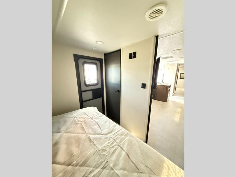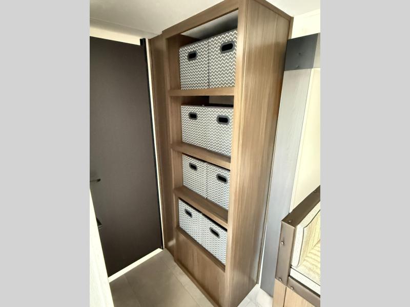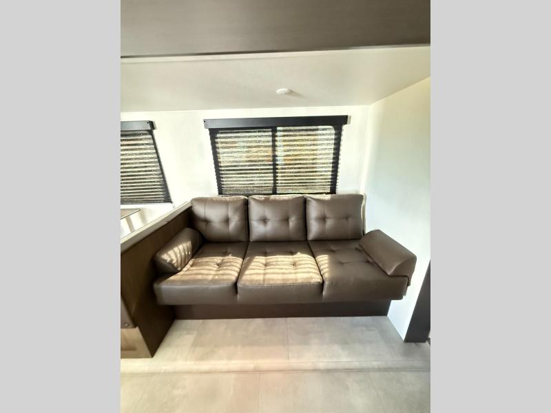 Every trip in this luxury travel trailer will be one to remember! Once you arrive at your destination, you can unload the pass-through storage, put out the 19' LED lit power awning, and grab a cold drink from the outside mini fridge. There are also dual entry doors which will allow you to enter in through the main living area or the front bedroom. A camp king bed with an ottoman underneath will provide a great night's rest, and there are dual bedside wardrobes to keep your things tidy. Your guests will love the rear private bunkhouse that includes a sofa with a bunk above plus a booth dinette and storage space for their things. While the chef of your group makes dinner in the kitchen, your crew can relax on the sofa or play a game at the booth dinette within the large slide out! This unit also features an entertainment center with a pantry and shelves behind it, plus there is a closet in the bedroom with washer and dryer prep for added convenience!